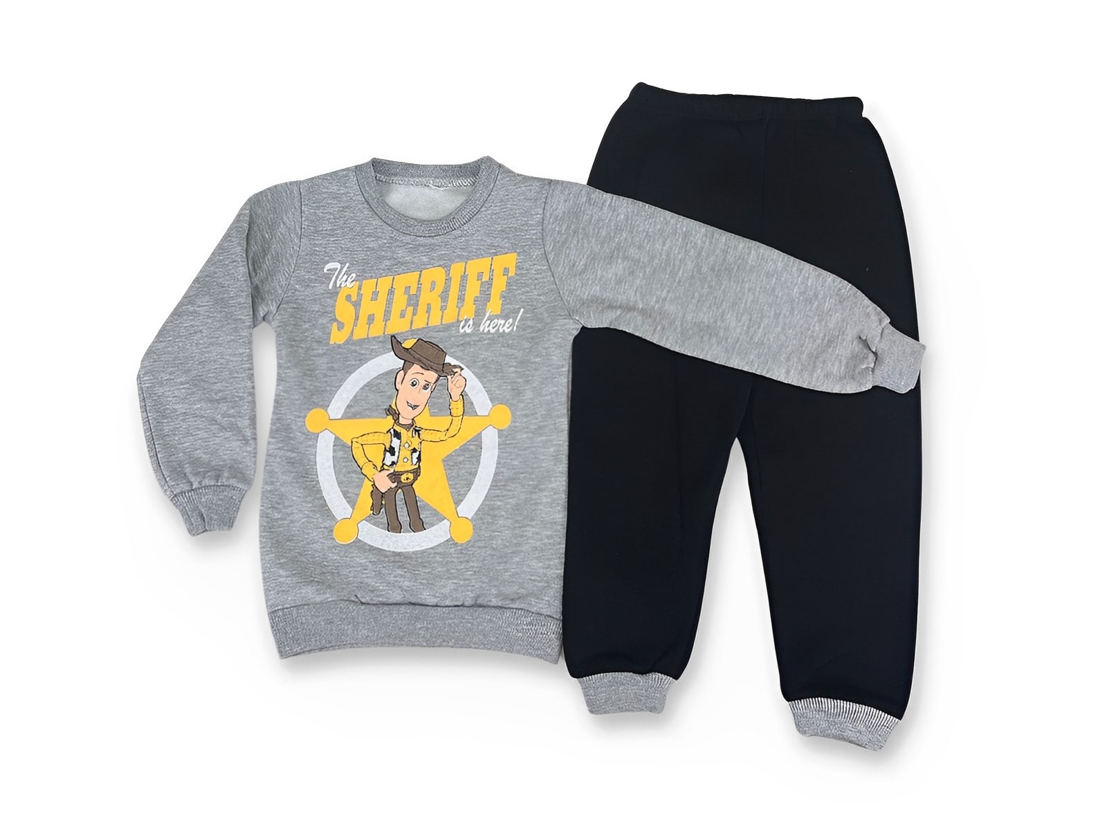Το σετ είναι χειμερινό από χοντρό φούτερ ύφασμα με χνούδι εσωτερικά και αποτελείται από μπλούζα και παντελόνι. Η μπλουζίτσα είναι σε γκρι χρώμα και έχει σχέδιο στάμπα τον αγαπημένο ήρωα κινουμένων σχεδίων των παιδιών και γράφει “The Sheriff is Here”! Το παντελονάκι είναι σε μαύρο χρώμα, ενώ έχει λάστιχο περιμετρικά στη μέση και στο κάτω μέρος. Ιδανικό για τις καθημερινές βόλτες αλλά και το σχολείο!!