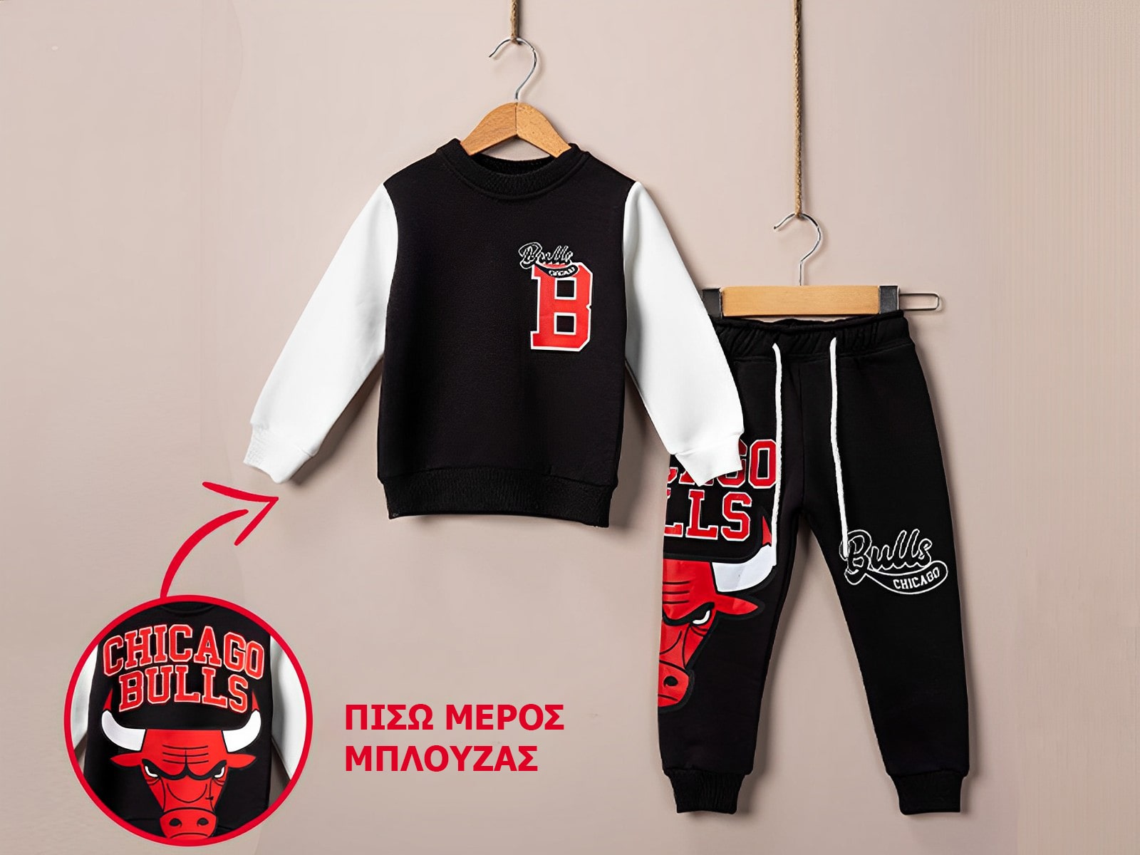 Το σετ είναι χειμερινό από χοντρό φούτερ ύφασμα με χνούδι εσωτερικά και αποτελείται από μπλούζα και παντελόνι. Η μπλουζίτσα είναι σε μαύρο χρώμα και έχει σχέδιο στάμπα σήμα ομάδας. Το παντελονάκι είναι σε μαύρο χρώμα, ενώ έχει λάστιχο περιμετρικά στη μέση και στο κάτω μέρος. Ιδανικό για τις καθημερινές βόλτες αλλά και το σχολείο!!