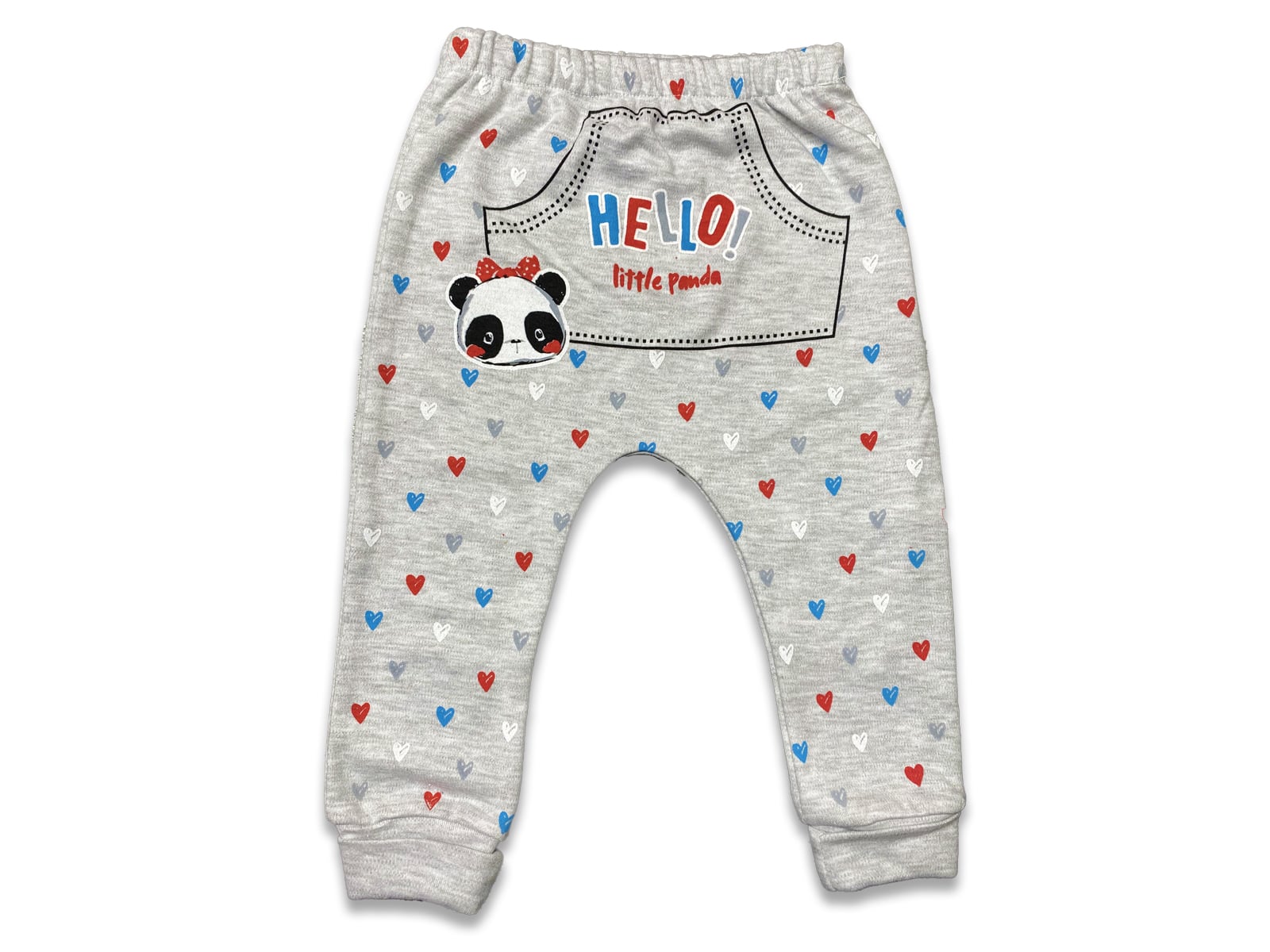 Παντελονάκι μακρύ με σχέδιο πάντα και καρδιές σε γκρι χρώμα και γράφει “Hello Little Panda”, ενώ έχει και λάστιχο περιμετρικά στη μέση και στο κάτω μέρος.