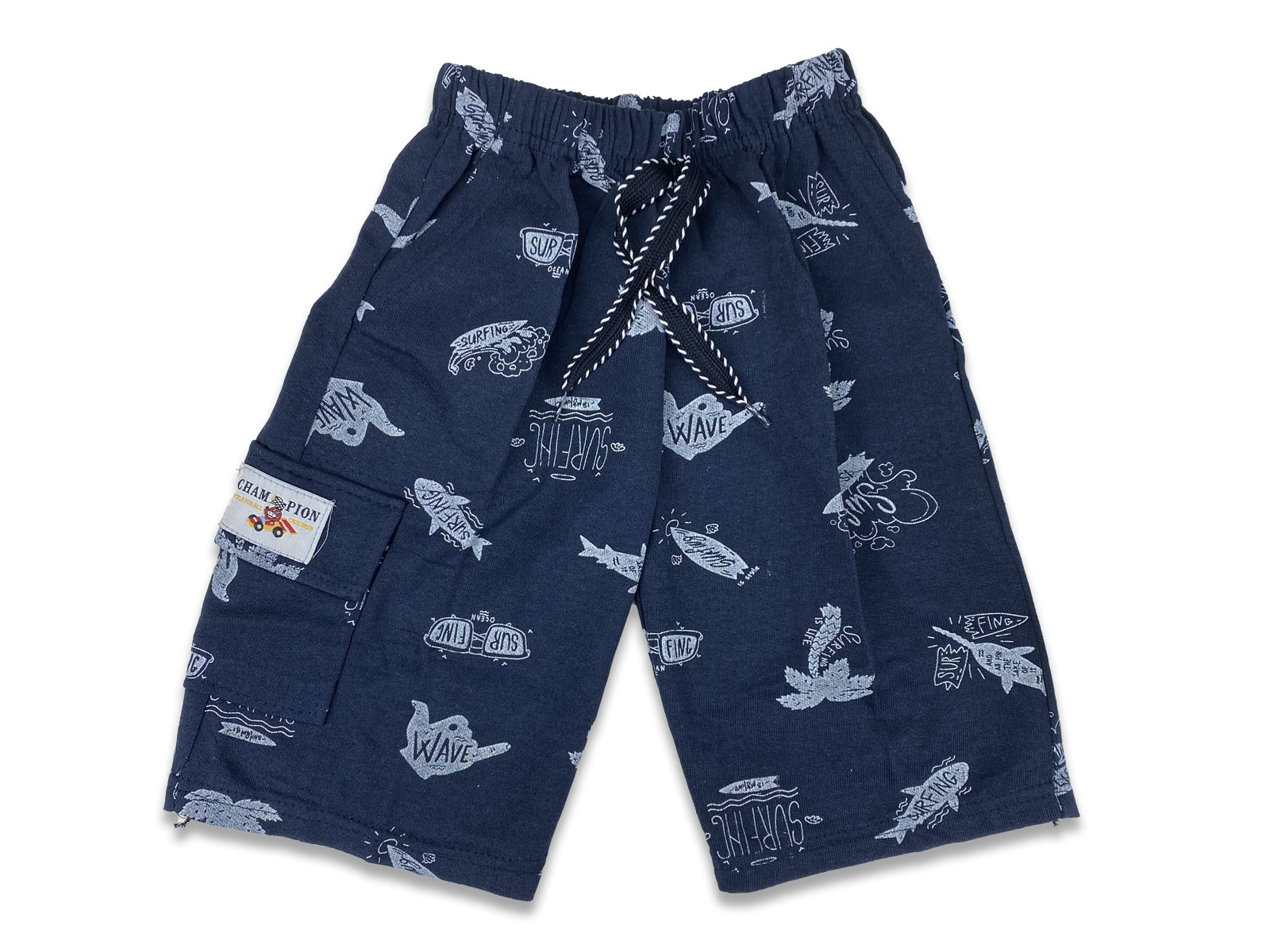 Το παντελονάκι αυτό είναι βερμούδα σε σκούρο μπλε χρώμα με σχέδιο φοίνικες και έχει τσεπούλες και λάστιχο περιμετρικά της μέσης.