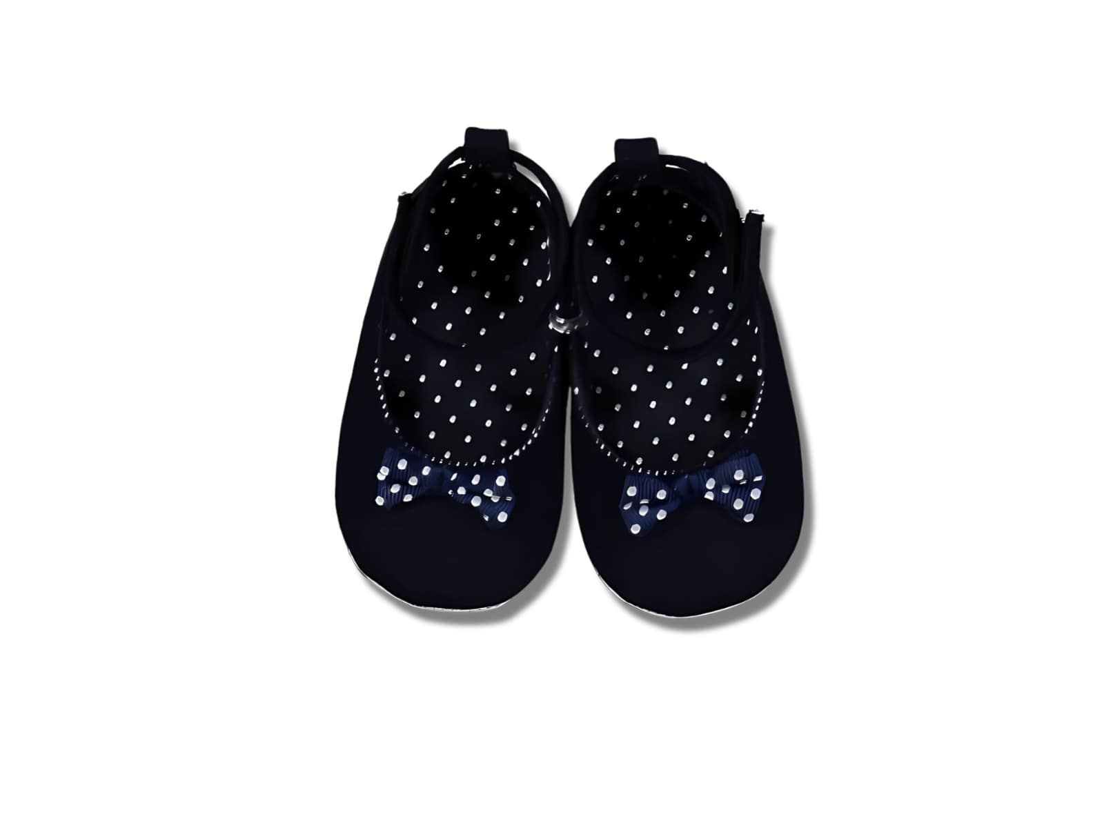 Παπουτσάκια αγκαλιάς κοριτσίστικα Μπαλανίνες με σχέδιο στον πάτο πουά, όπως και στο φιογκάκι, με άνοιγμα velcro και σε χρώμα σκούρο μπλε.