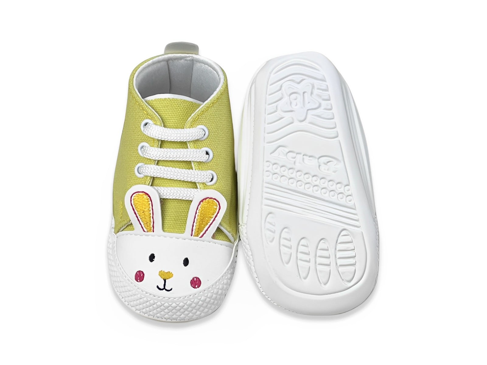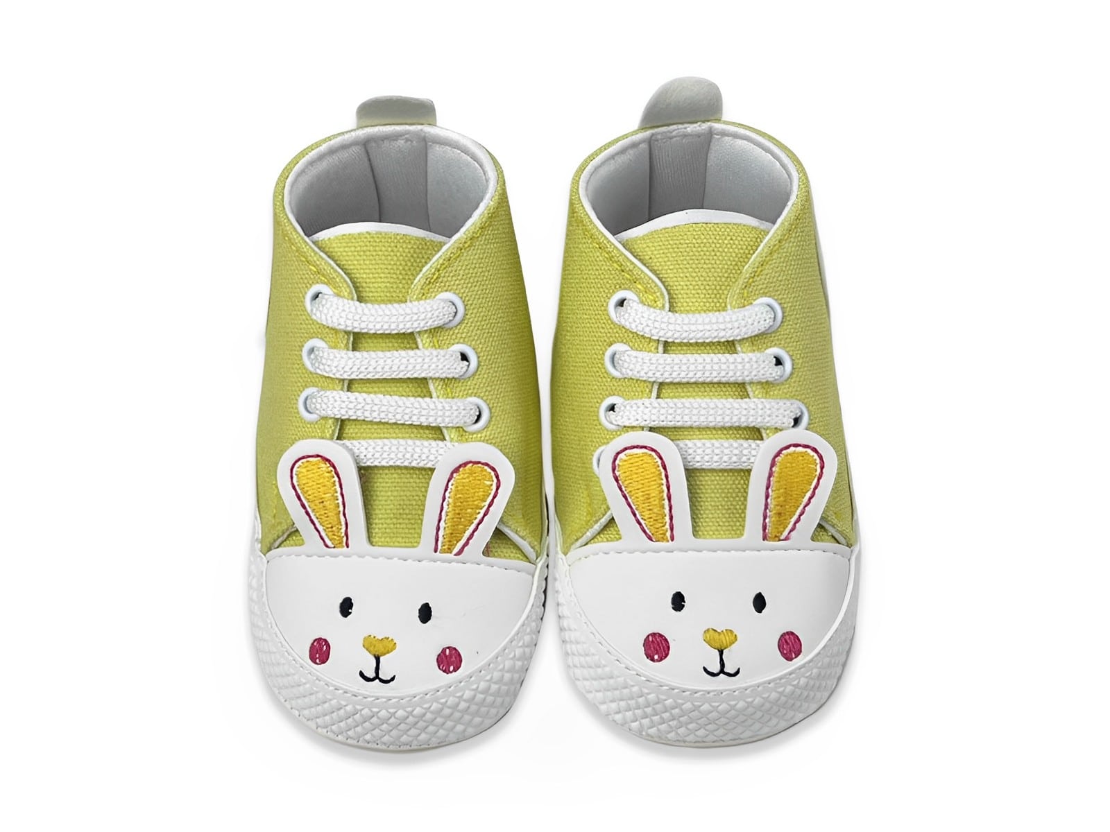 Βρεφικά παπουτσάκια αγκαλιάς με κορδονάκια σε κίτρινο χρώμα και σχέδιο λαγουδάκι. Ιδανικά για να προστατεύουν τα πόδια των μικρών μας φίλων!