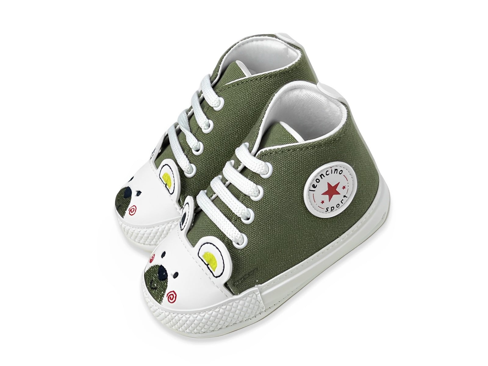Βρεφικά παπουτσάκια αγκαλιάς με κορδονάκια σε χακί χρώμα και σχέδιο αρκουδάκι. Ιδανικά για να προστατεύουν τα πόδια των μικρών μας φίλων!