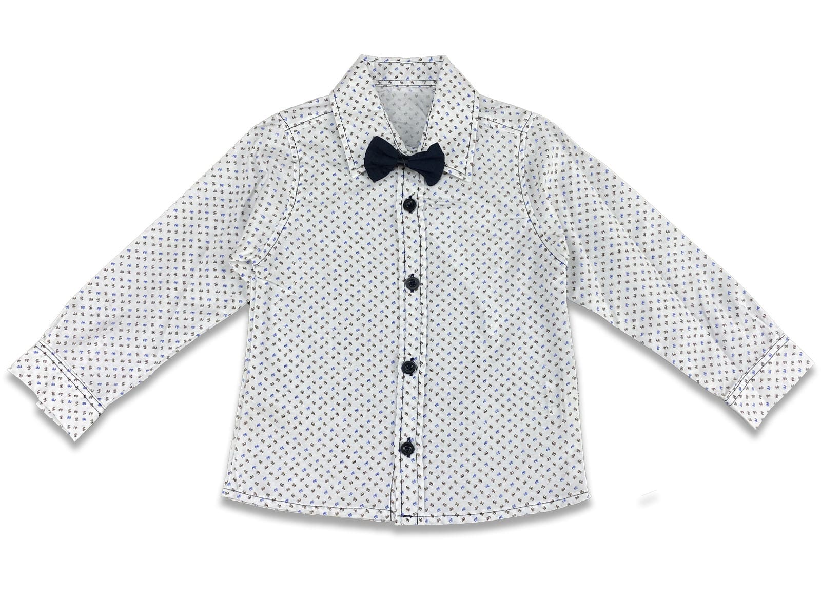 Το πουκαμισάκι είναι μακρυμάνικο σε άσπρο χρώμα με σχεδιάκια και άνοιγμα με κουμπάκια. Το παπιγιόν είναι σε σκούρο μπλε χρώμα αποσπώμενο.