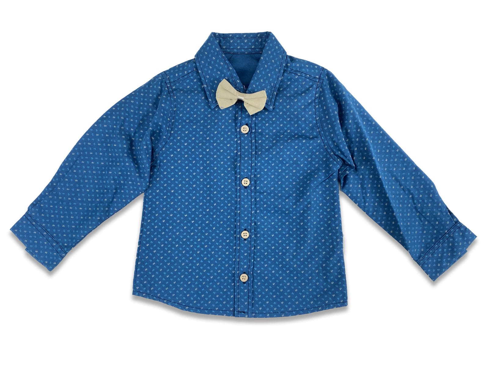 Το πουκαμισάκι είναι μακρυμάνικο σε μπλε χρώμα με σχεδιάκια και άνοιγμα με κουμπάκια. Το παπιγιόν είναι σε μπεζ χρώμα αποσπώμενο.