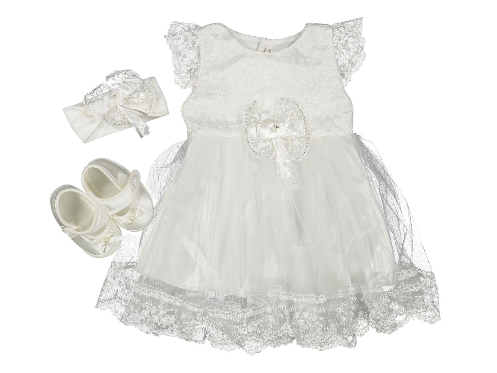 Το σετ αυτό είναι για επίσημες περιστάσεις όπως βαφτίσεις κλπ, και αποτελείται από ένα φορεματάκι, παπουτσάκια και κορδέλα. Το φόρεμα είναι σε άσπρο χρώμα με τούλι και βολάν στα μανίκια και είναι διακοσμημένο με λουλουδάκια και ένα φιογκάκι στο μπροστινό μέρος του ενώ εσωτερικά έχει και σατέν άσπρη φόδρα. Τα παπουτσάκια είναι σε άσπρο χρώμα με φιογκάκια και έχουν χρατς αυτοκόλλητο για ιδανική εφαρμογή. Η κορδελίτσα είναι σε άσπρο χρώμα με φιογκάκι και μαργαριτάρι.