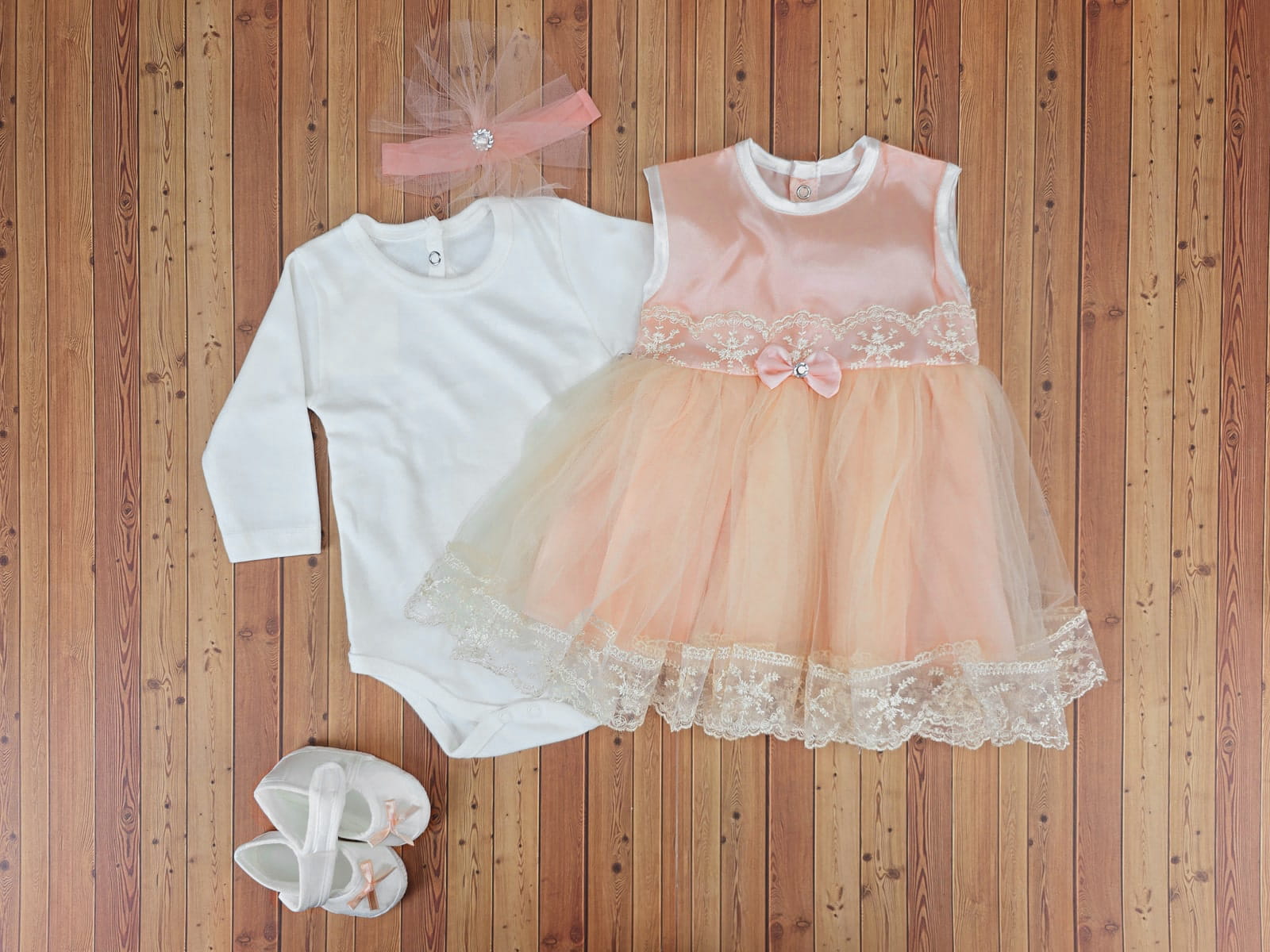 Σετ 4 κομμάτια με Κορμάκι, Φορεματάκι, Παπουτσάκια και Κορδελίτσα – Σομόν (89986)