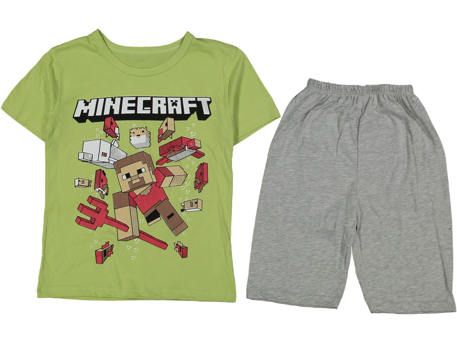 Το σετ αυτό αποτελείται από μία κοντομάνικη μπλουζίτσα και ένα παντελονάκι βερμούδα. Η μπλούζα είναι σε λαχανί χρώμα, με στάμπα αγαπημένο ήρωα κινουμένων σχεδίων. Η βερμούδα είναι σε γκρι χρώμα και έχει λάστιχο περιμετρικά στην μέση.
