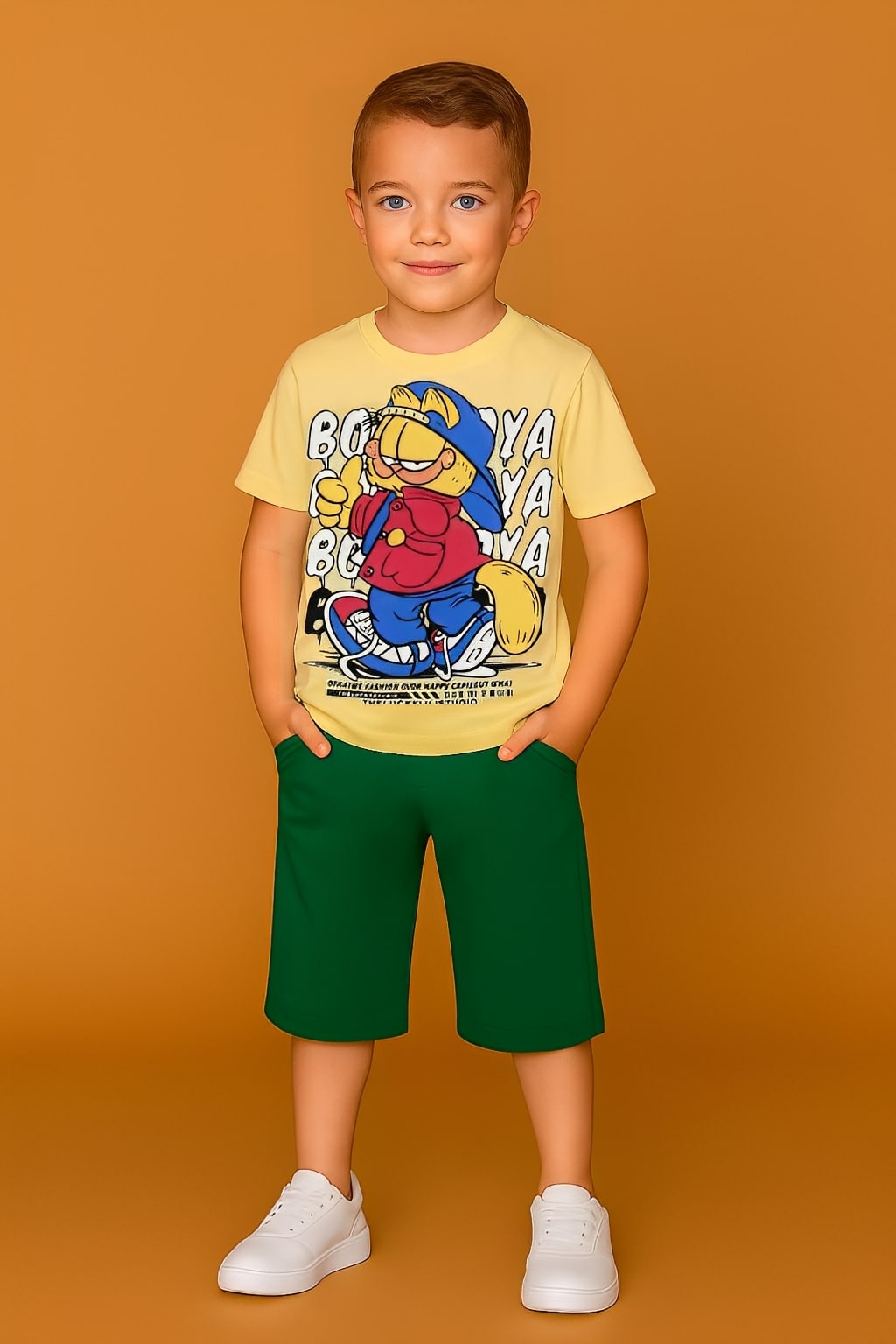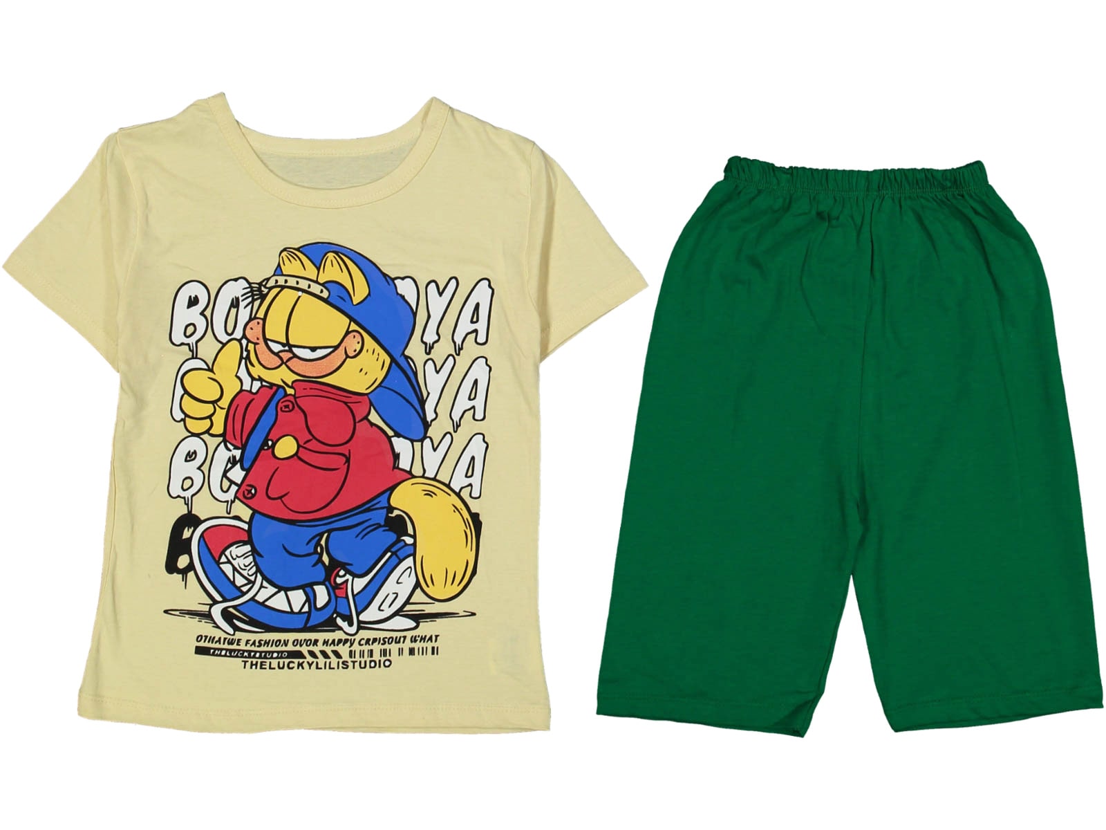 Το σετ αυτό αποτελείται από μία κοντομάνικη μπλουζίτσα και ένα παντελονάκι βερμούδα. Η μπλούζα είναι σε μπεζ χρώμα, με στάμπα αγαπημένο ήρωα κινουμένων σχεδίων. Η βερμούδα είναι σε πράσινο χρώμα και έχει λάστιχο περιμετρικά στην μέση.