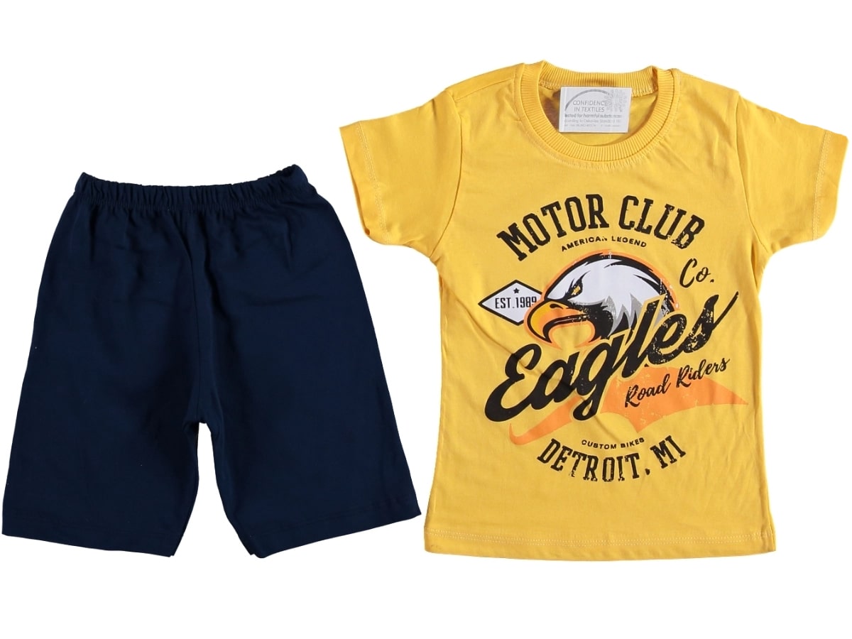 Το σετ αυτό αποτελείται από μία κοντομάνικη μπλουζίτσα και ένα παντελονάκι. Η μπλουζίτσα είναι σε κίτρινο χρώμα και γράφει “Motor Club Eagles”. Η βερμούδα έχει λάστιχο περιμετρικά στη μέση.