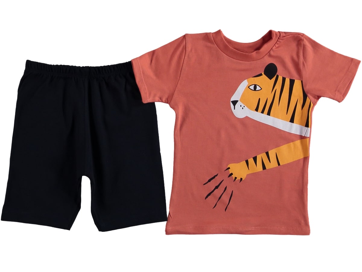 Το σετ αυτό αποτελείται από μία κοντομάνικη μπλουζίτσα και ένα παντελονάκι. Η μπλουζίτσα είναι σε κεραμιδί χρώμα με σχέδιο στάμπα τίγρη. Η βερμούδα είναι σε σκούρο μπλε και έχει λάστιχο περιμετρικά στη μέση.