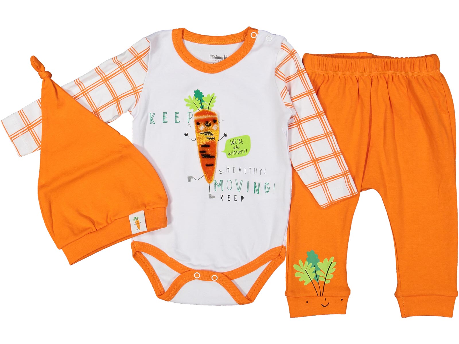Το σετ αποτελείται από ένα κορμάκι, ένα παντελονάκι και ένα σκουφάκι. Το κορμάκι είναι άσπρο με σχέδιο ανάγλυφο καροτάκι και γράφει “Keep Moving”. Το σκουφάκι είναι σε πορτοκαλί χρώμα, όπως και το παντελονάκι, το οποίο έχει στάμπα φατσούλα και έχει λάστιχο περιμετρικά και στο κάτω μέρος.