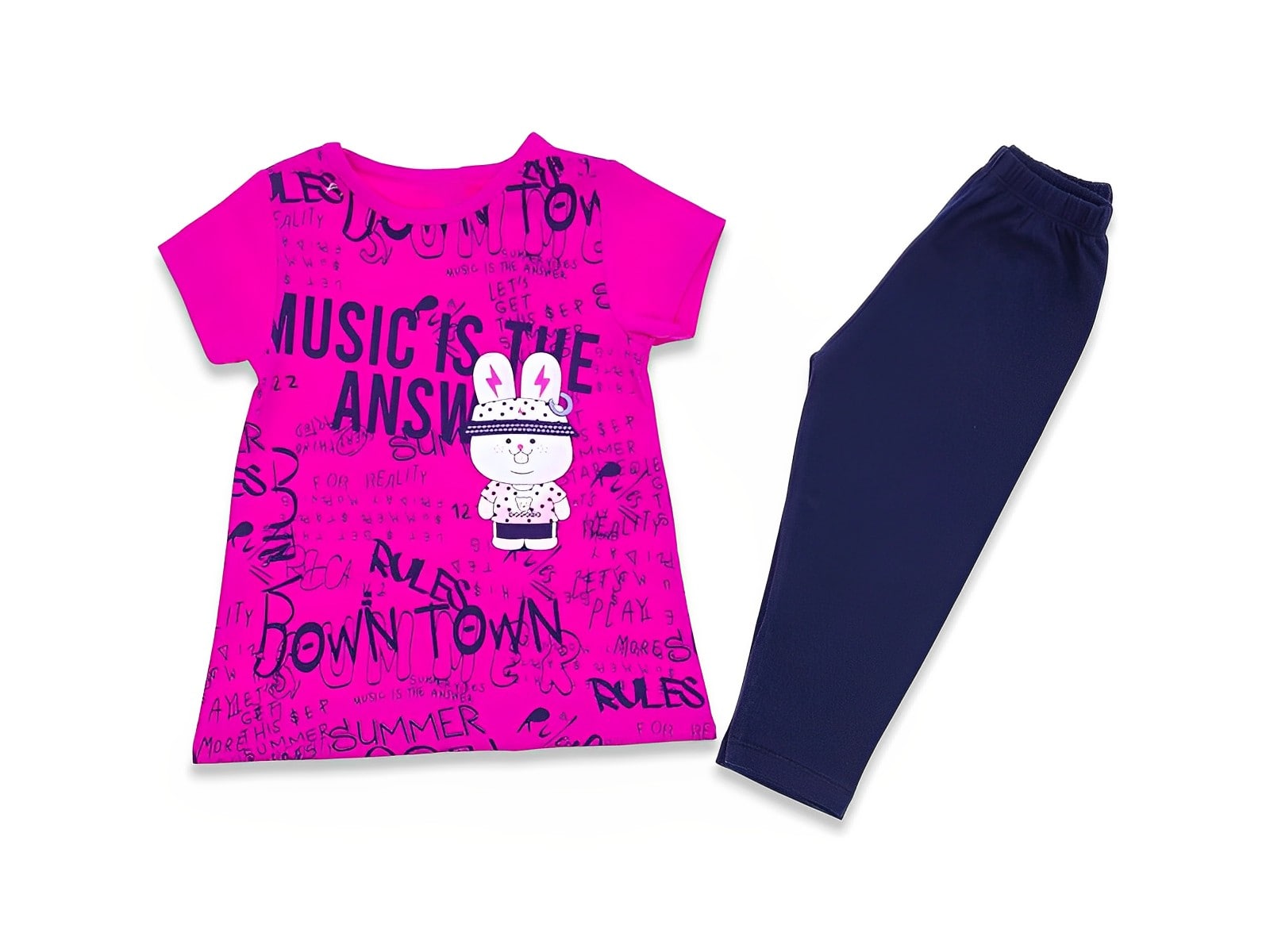Το σετ αποτελείται από μία κοντομάνικη μπλουζίτσα και ένα παντελόνι κάπρι. Η μπλούζα είναι σε φούξια χρώμα με σχέδιο λαγουδάκι και γράφει “Music Is The Answer”. Το παντελονάκι είναι κάπρι σε σκούρο μπλε χρώμα και έχει λάστιχο περιμετρικά στη μέση.