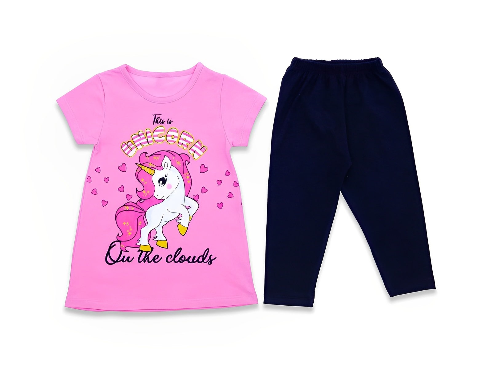 Το σετ αποτελείται από μία κοντομάνικη μπλουζίτσα και ένα παντελόνι κάπρι. Η μπλούζα είναι σε ροζ χρώμα με σχέδιο μονόκερω ( Unicorn ) και γράφει “On The Clouds”. Το παντελονάκι είναι κάπρι σε σκούρο μπλε χρώμα και έχει λάστιχο περιμετρικά στη μέση.