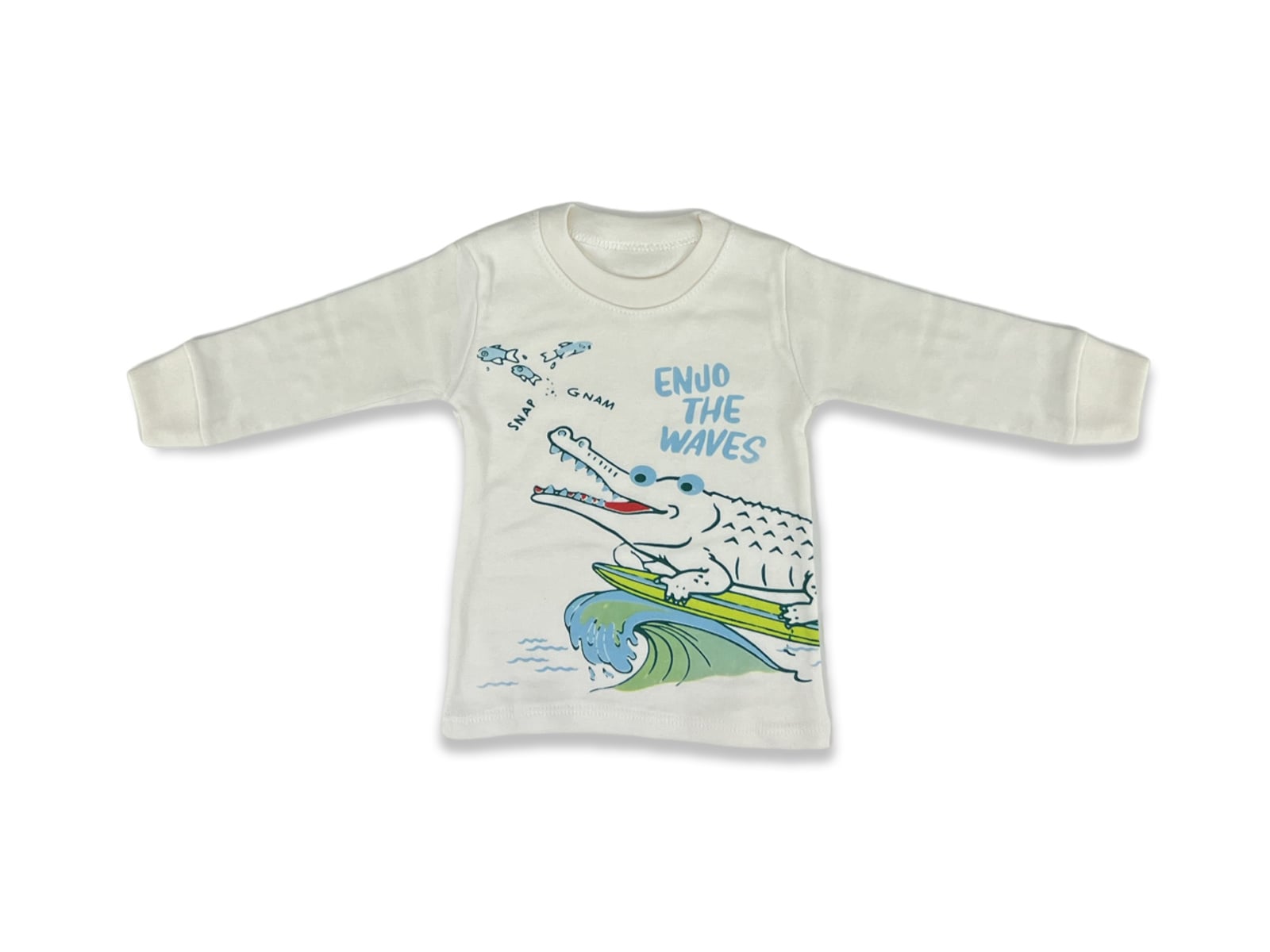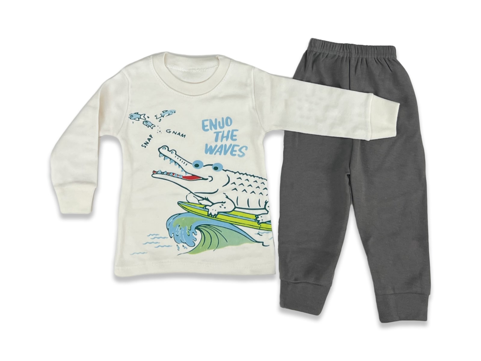 Το σετ αποτελείται από μπλουζίτσα και παντελονάκι. Η μπλουζίτσα είναι μακρυμάνικη σε μπεζ χρώμα με στάμπα ζωάκι κροκόδειλο που γράφει “Enjoy The Waves”. Το παντελονάκι είναι σε ανθρακί χρώμα και έχει λάστιχο περιμετρικά στη μέση και στους αστραγάλους.