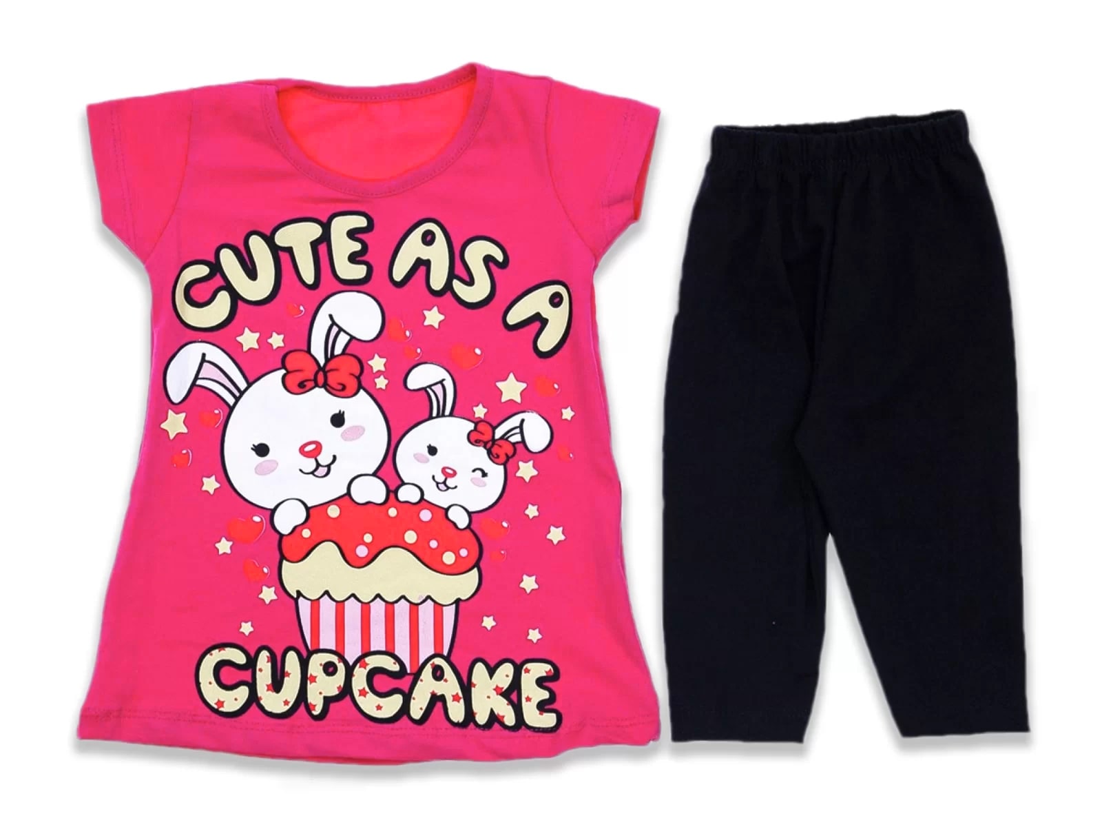 Το σετ αποτελείται από μία κοντομάνικη μπλουζίτσα και ένα παντελονάκι κολάν κάπρι. Η μπλουζίτσα είναι σε κοραλί χρώμα με σχέδιο γλυκάκι και λαγουδάκια και γράφει “Cute as a Cupcake”. Το παντελονάκι είναι κολάν κάπρι σε σκούρο μπλε χρώμα και έχει λάστιχο περιμετρικά στη μέση.