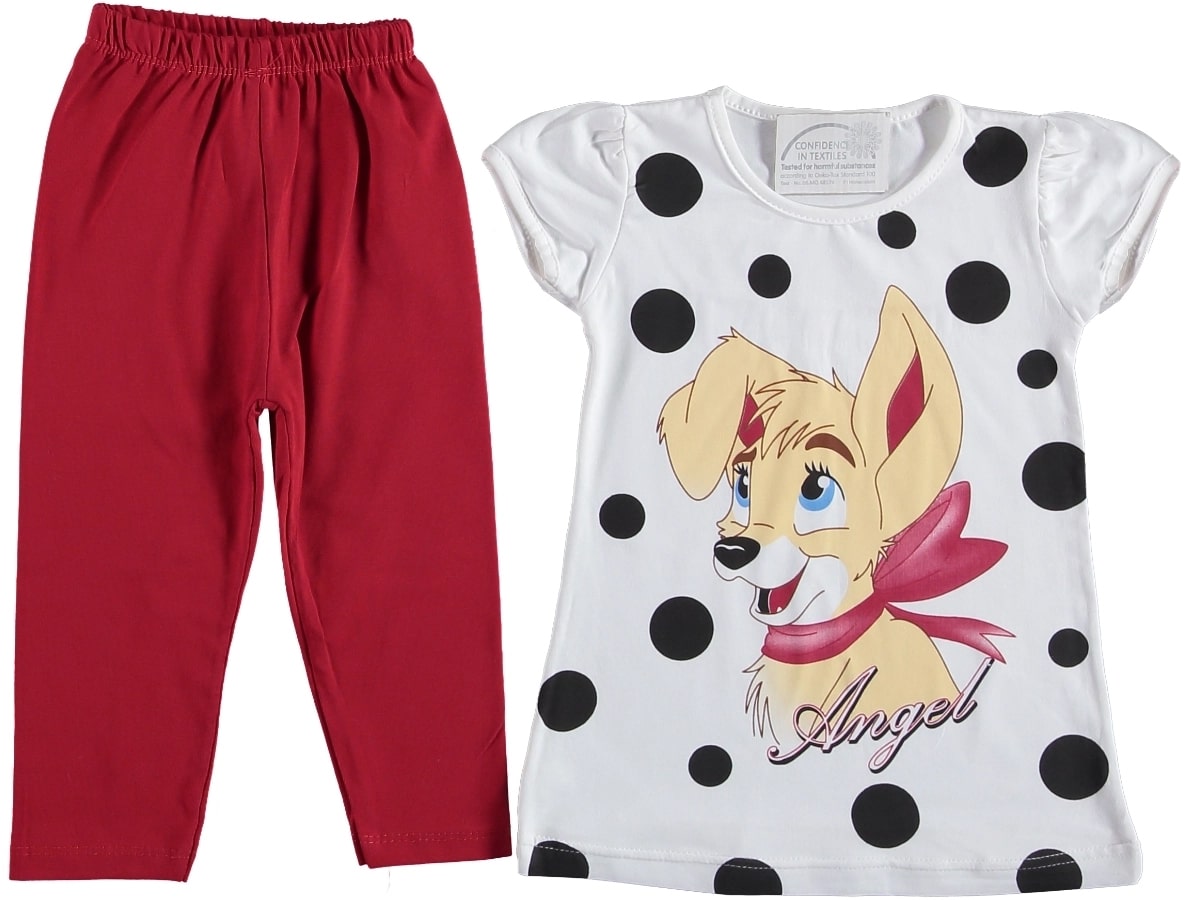 Το σετ αποτελείται από μία κοντομάνικη μπλουζίτσα και ένα παντελονάκι κολάν κάπρι. Η μπλουζίτσα είναι σε άσπρο χρώμα με σχέδιο σκυλάκι και γράφει “Angel”. Το παντελονάκι είναι κολάν κάπρι σε κόκκινο και έχει λάστιχο περιμετρικά στη μέση.