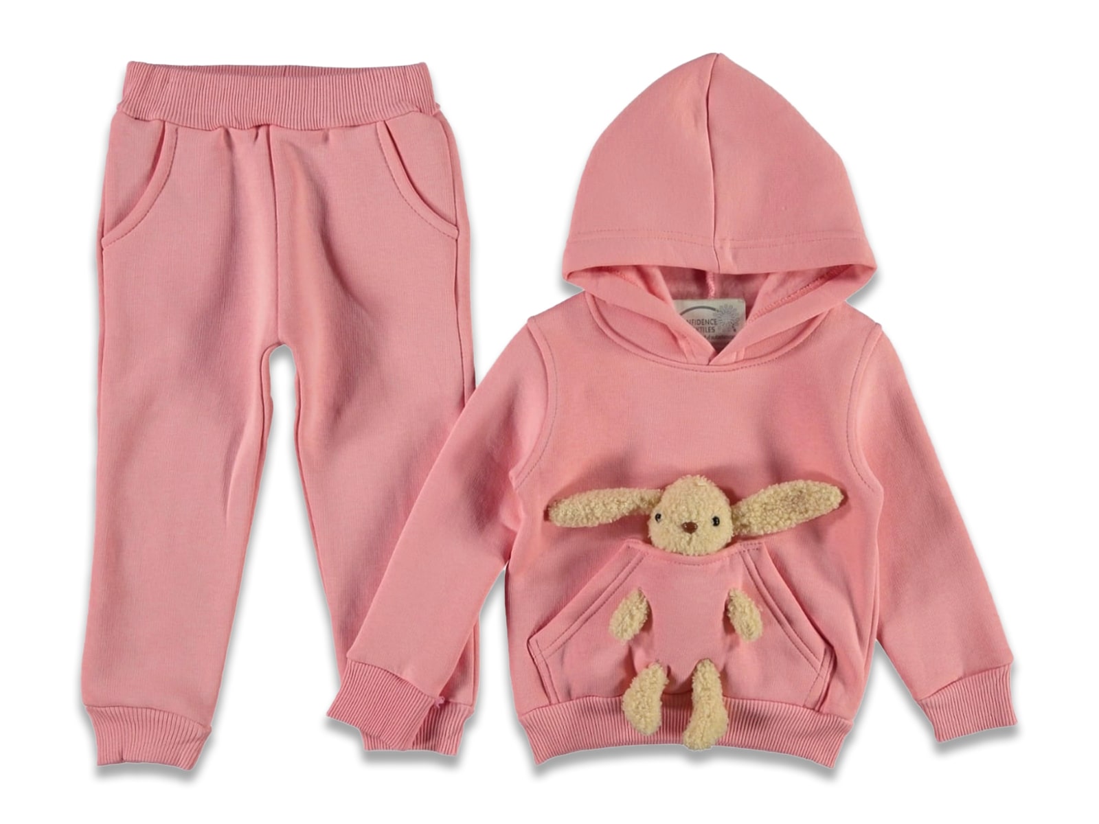 Το σετ αυτό αποτελείται από μπλουζίτσα και παντελονάκι. Η μπλουζίτσα έχει κουκούλα και τσέπη, είναι σε ροζ χρώμα και έχει αποσπώμενο λούτρινο λαγουδάκι. Το παντελονάκι είναι και αυτό σε ροζ χρώμα έχει τσεπούλες και λάστιχο περιμετρικά στη μέση.
