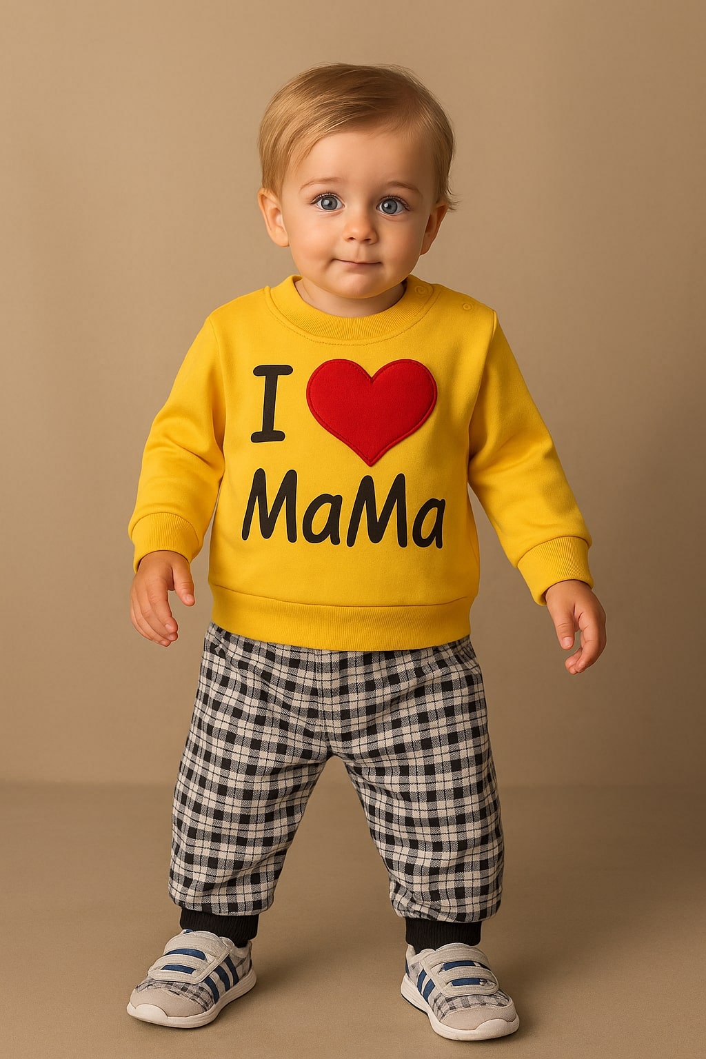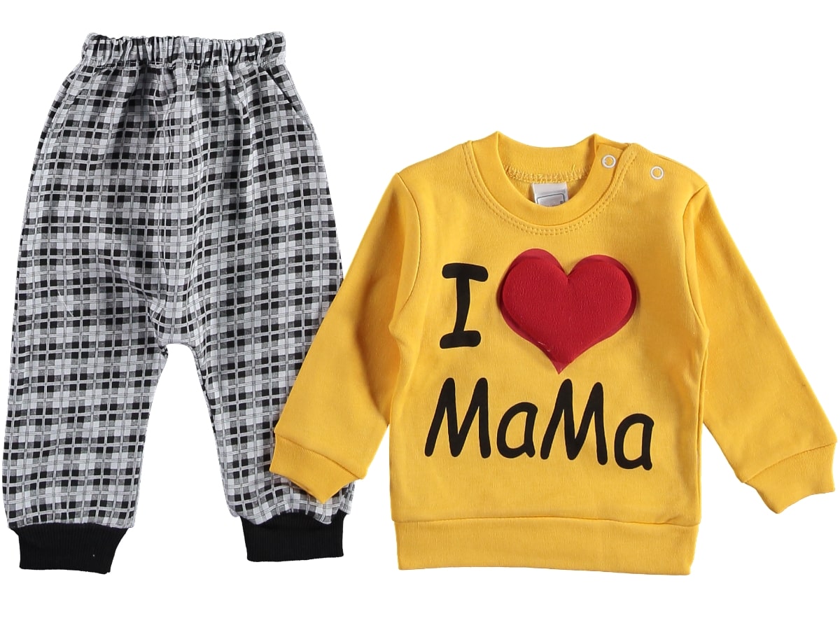 Το σετ αυτό αποτελείται από μία μπλουζίτσα και ένα παντελονάκι. Η μπλουζίτσα είναι σε κίτρινο χρώμα και κολλημένη 3D καρδούλα και στάμπα που γράφει “I Love Mama”. Το παντελονάκι έχει λάστιχο περιμετρικά στη μέση και στο κάτω μέρος.