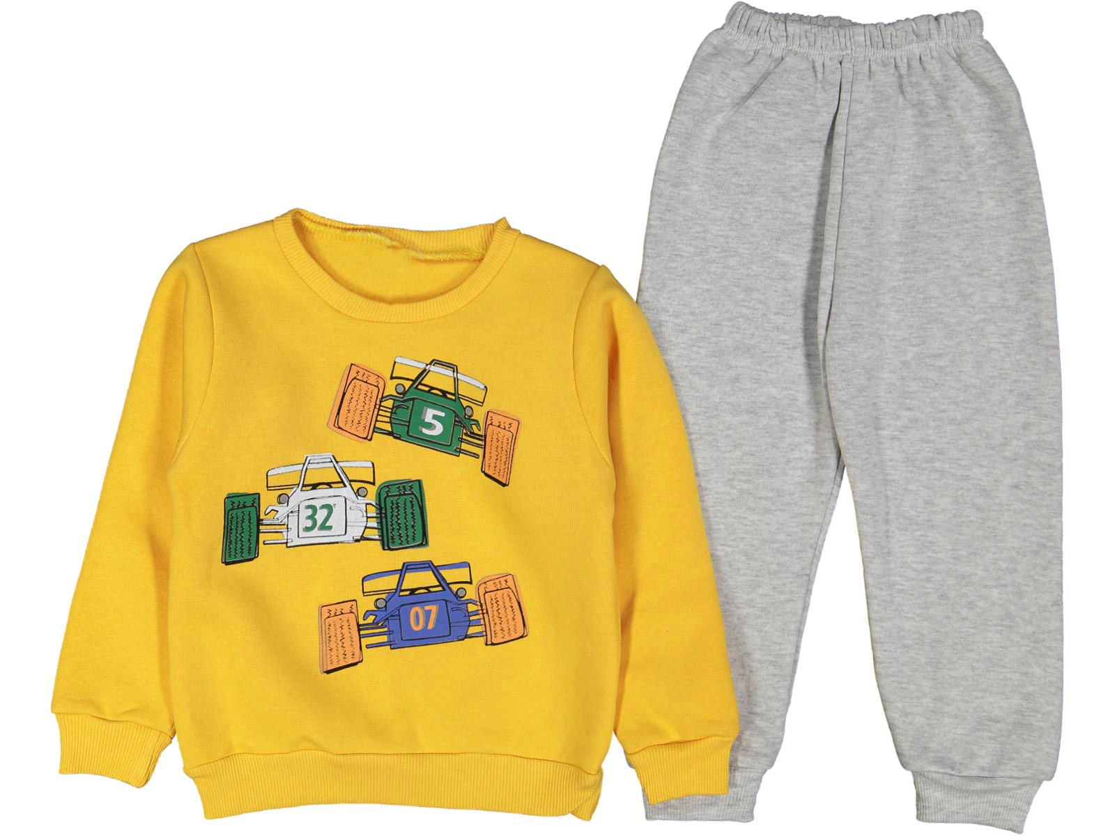 Το σετ είναι από χοντρό φούτερ ύφασμα και αποτελείται από μπλουζίτσα και παντελονάκι. Η μπλουζίτσα είναι σε κίτρινο χρώμα και έχει σχέδιο στάμπα αυτοκινητάκια φορμουλα 1 και γράφει “5 32 07”. Το παντελονάκι είναι σε γκρι χρώμα και λάστιχο περιμετρικά στη μέση και στο κάτω μέρος.