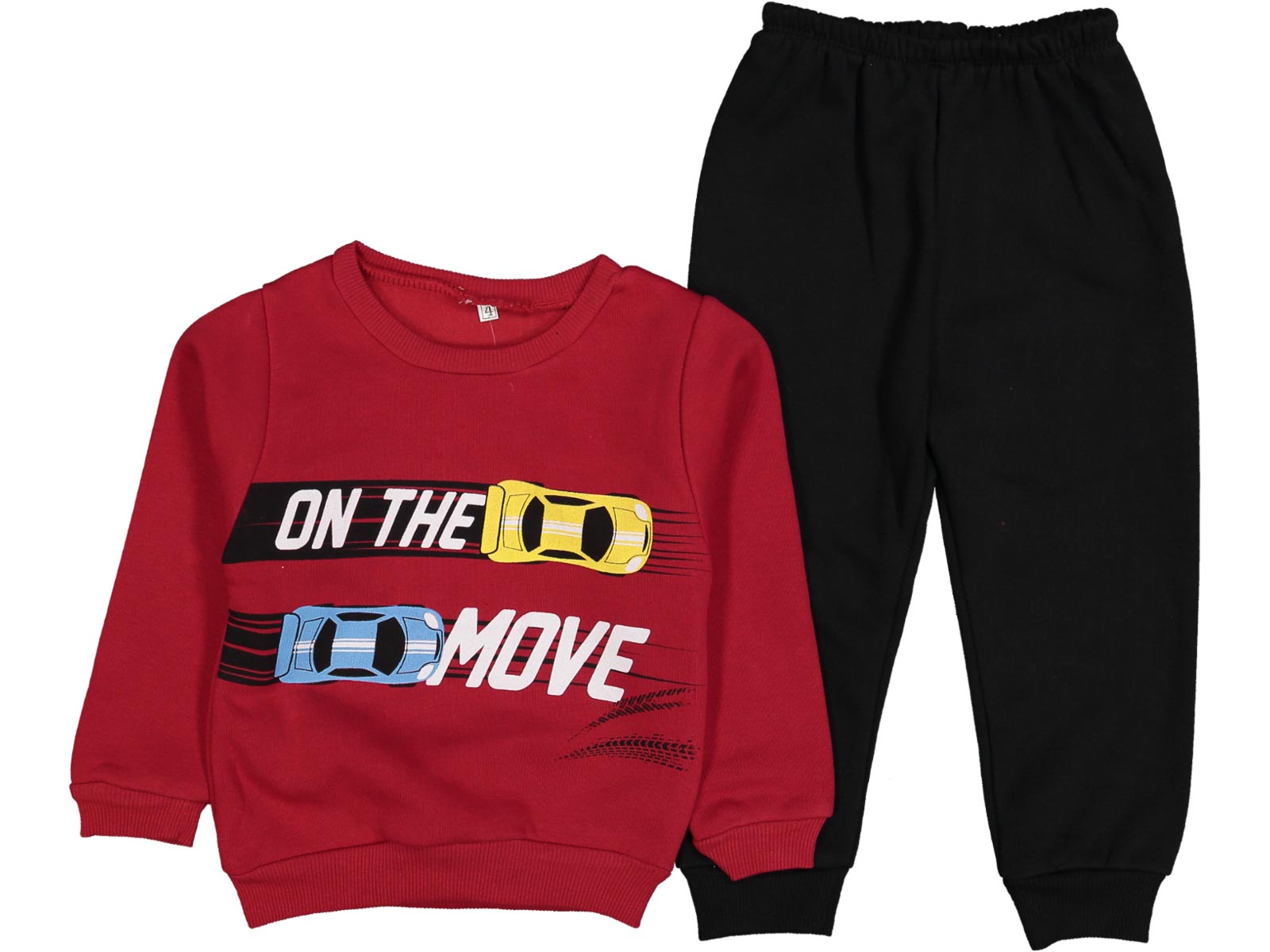 Το σετ είναι από χοντρό φούτερ ύφασμα και αποτελείται από μπλουζίτσα και παντελονάκι. Η μπλουζίτσα είναι σε κόκκινο χρώμα και έχει σχέδιο στάμπα αυτοκίνητα και γράφει “On The Move”. Το παντελονάκι είναι σε μαύρο χρώμα και λάστιχο περιμετρικά στη μέση και στο κάτω μέρος.