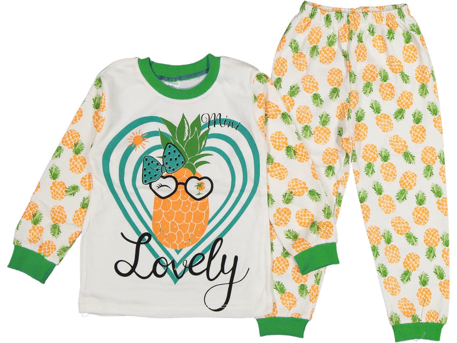 Το σετ αυτό αποτελείται από μπλουζίτσα και παντελονάκι. Η μπλουζίτσα είναι σε πράσινο χρώμα και έχει σχέδιο στάμπα ανανά και γράφει “Lovely”. Το παντελονάκι είναι στο ίδιο σχέδιο και έχει λάστιχο περιμετρικά στη μέση.