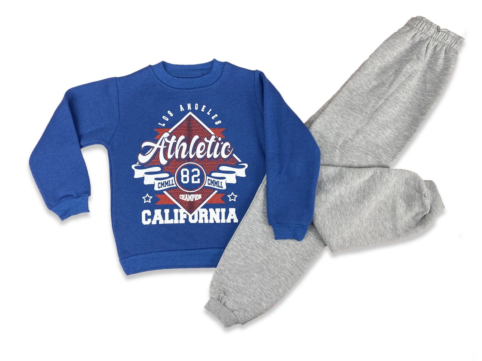Το σετ είναι από χοντρό φούτερ ύφασμα με χνούδι εσωτερικά και αποτελείται από μπλουζίτσα και παντελονάκι. Η μπλουζίτσα είναι σε μπλε χρώμα και έχει σχέδιο στάμπα και γράφει “Athletic California 82”. Το παντελονάκι είναι σε γκρι χρώμα και λάστιχο περιμετρικά στη μέση και στο κάτω μέρος.