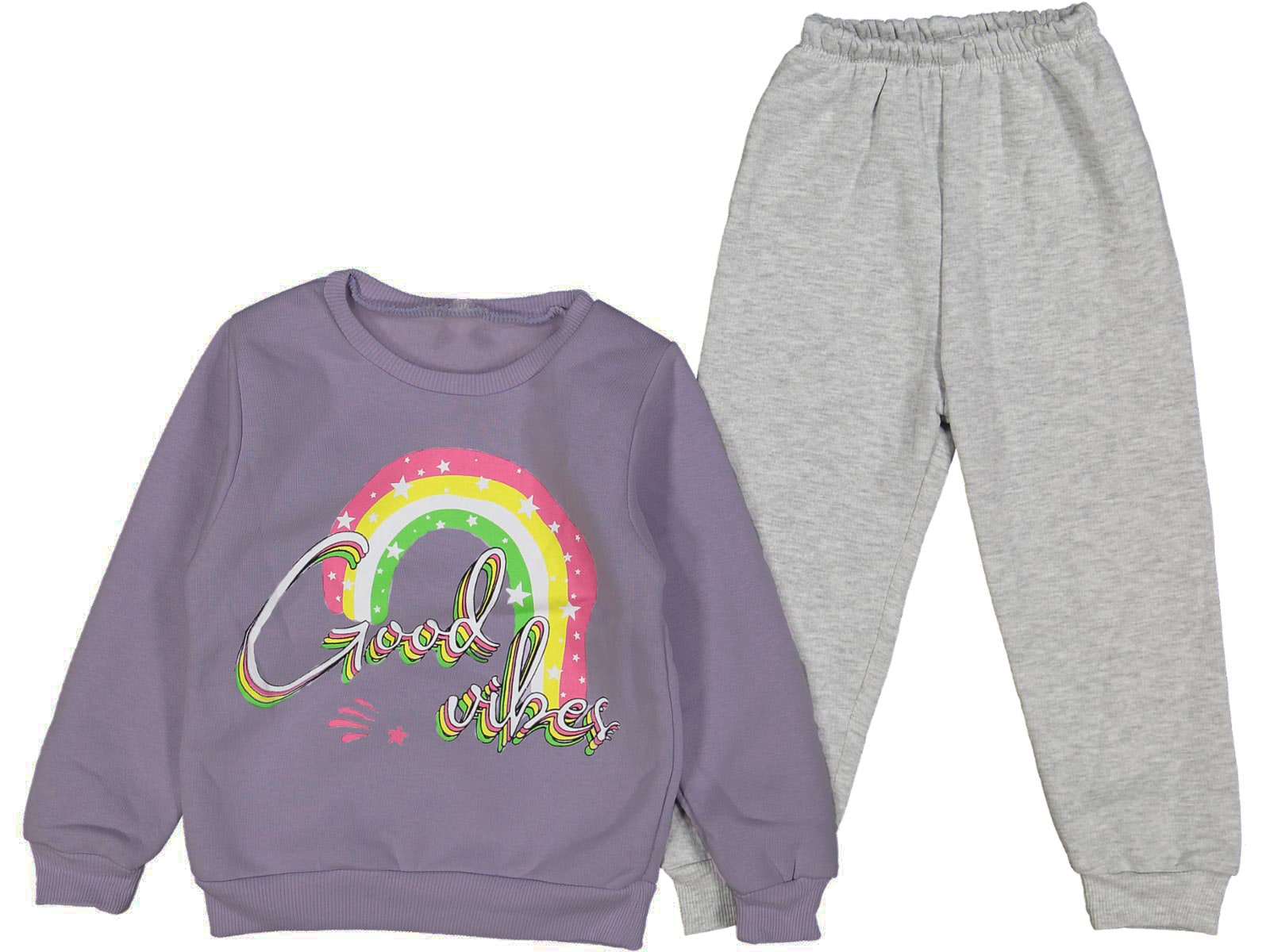 Το σετ είναι από χοντρό φούτερ ύφασμα και αποτελείται από μπλουζίτσα και παντελονάκι. Η μπλουζίτσα είναι σε λιλά χρώμα και έχει σχέδιο στάμπα ουράνιο τόξο και γράφει “Good Vibes”. Το παντελονάκι είναι σε γκρι χρώμα και λάστιχο περιμετρικά στη μέση και στο κάτω μέρος.