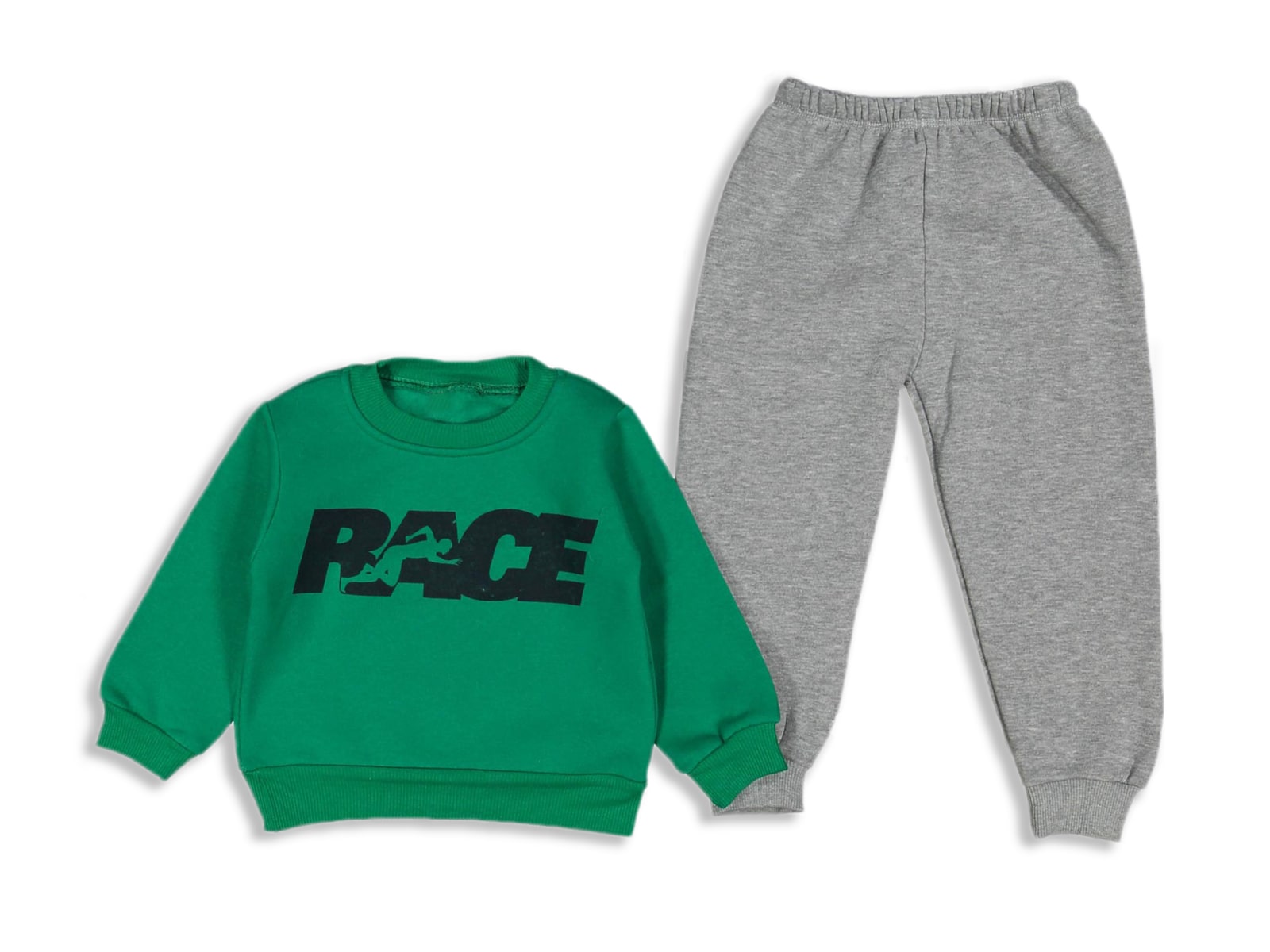 Το σετ είναι από χοντρό φούτερ ύφασμα με χνούδι εσωτερικά και αποτελείται από μπλουζίτσα και παντελονάκι. Η μπλουζίτσα είναι σε πράσινο χρώμα και έχει στάμπα που γράφει “Race”. Το παντελονάκι είναι σε γκρι χρώμα και λάστιχο περιμετρικά στη μέση και στο κάτω μέρος.