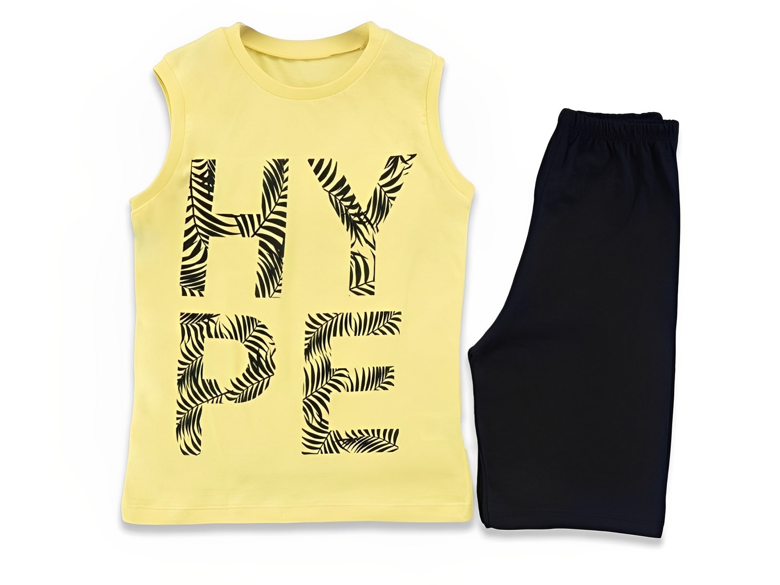 Το σετ αυτό αποτελείται από μία αμάνικη μπλουζίτσα και ένα παντελονάκι. Η μπλουζίτσα είναι σε κίτρινο χρώμα με σχέδιο και γράφει “HYPE”. Το σορτσάκι είναι σε μαύρο χρώμα και έχει λάστιχο περιμετρικά στη μέση.
