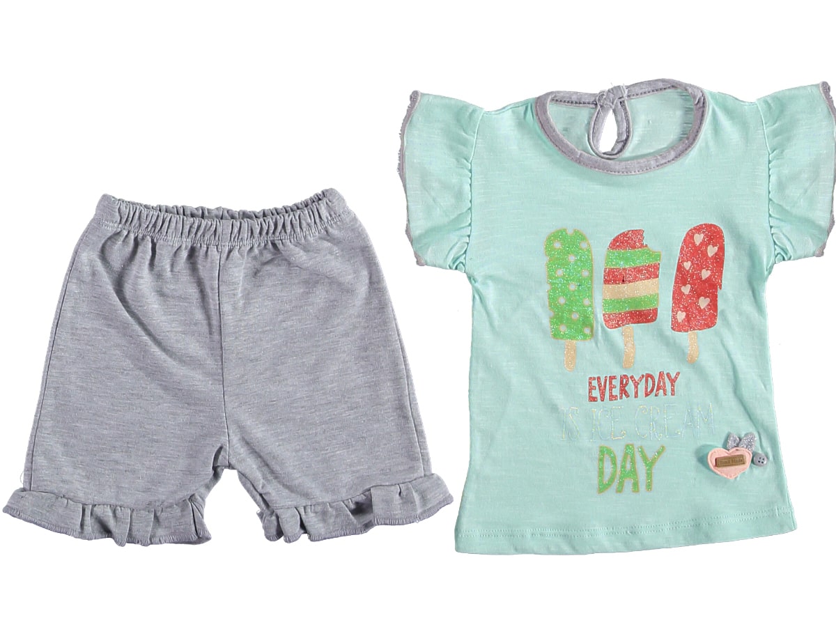 Το σετ αυτό αποτελείται από μία κοντομάνικη μπλουζίτσα και ένα παντελονάκι. Η μπλουζίτσα είναι σε βεραμάν χρώμα και έχει σχέδιο στάμπα παγωτά με γκλίτερ και γράφει “Everyday Is Ice Cream Day”, ενώ έχει και βολάν στα μανίκια. Το σορτσάκι είναι σε γκρι χρώμα και έχει λάστιχο περιμετρικά στη μέση και βολάν στο τελείωμα.