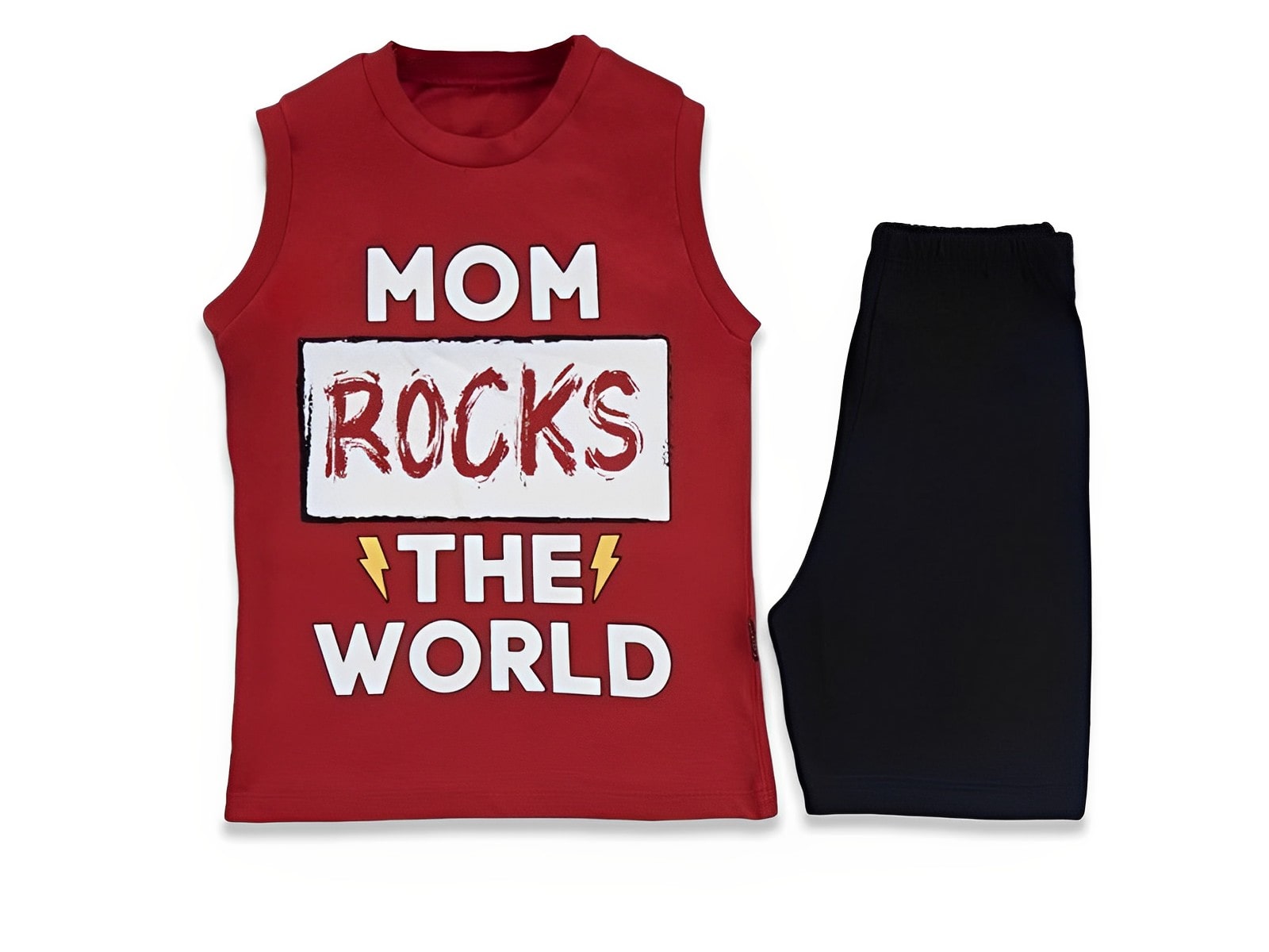 Το σετ αυτό αποτελείται από μία αμάνικη μπλουζίτσα και ένα παντελονάκι. Η μπλουζίτσα είναι σε κόκκινο χρώμα με σχέδιο και γράφει “Mom Rocks the World”. Το σορτσάκι είναι σε μαύρο χρώμα και έχει λάστιχο περιμετρικά στη μέση.