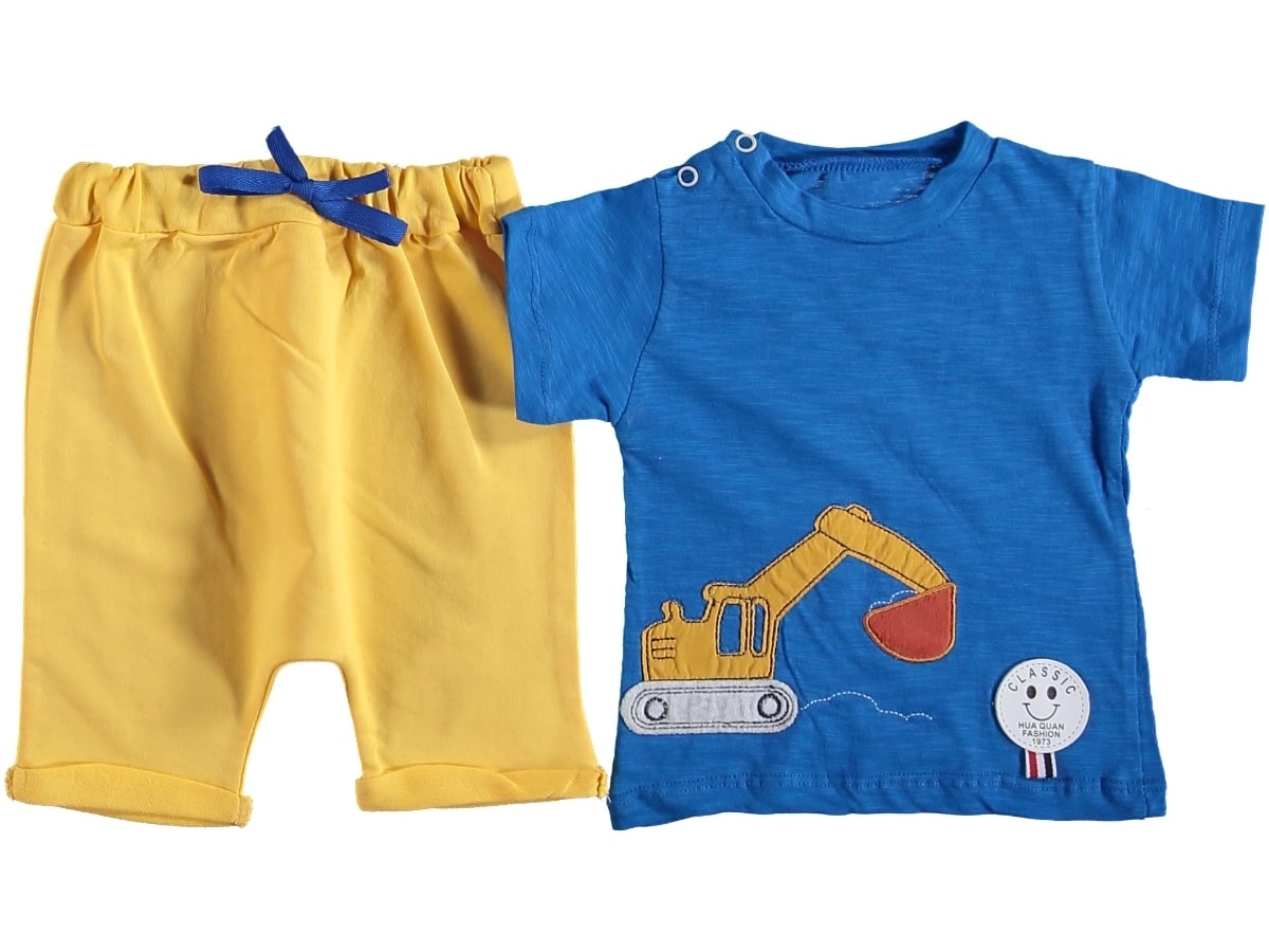 Το σετ αυτό αποτελείται από ένα μπλουζάκι κοντομάνικο και μια βερμούδα. Το μπλουζάκι είναι μπλε με σχέδιο απλικέ μπουλντόζα. Η βερμούδα είναι σε κίτρινο χρώμα και έχει λάστιχο περιμετρικά στη μέση και ρεβέρ στο κάτω μέρος.