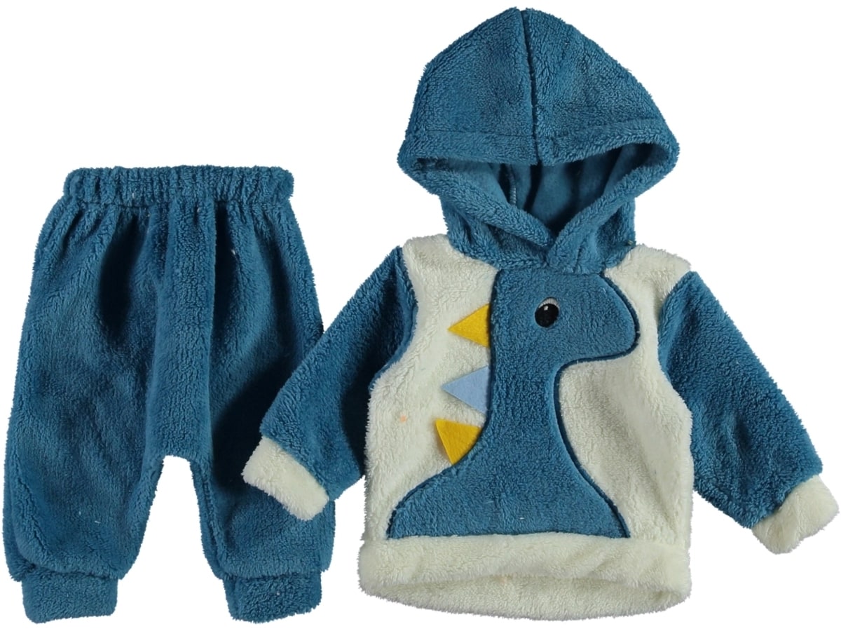 Το σετ είναι fleece (φλις) και αποτελείται από μια μπλουζίτσα με κουκούλα και ένα παντελονάκι. Η μπλουζίτσα είναι σε άσπρο και μπλε χρώμα με σχέδιο απλικέ δεινοσαυράκι με 3D πτερύγια. Το παντελονάκι έχει λάστιχο περιμετρικά στη μέση και στο κάτω μέρος.