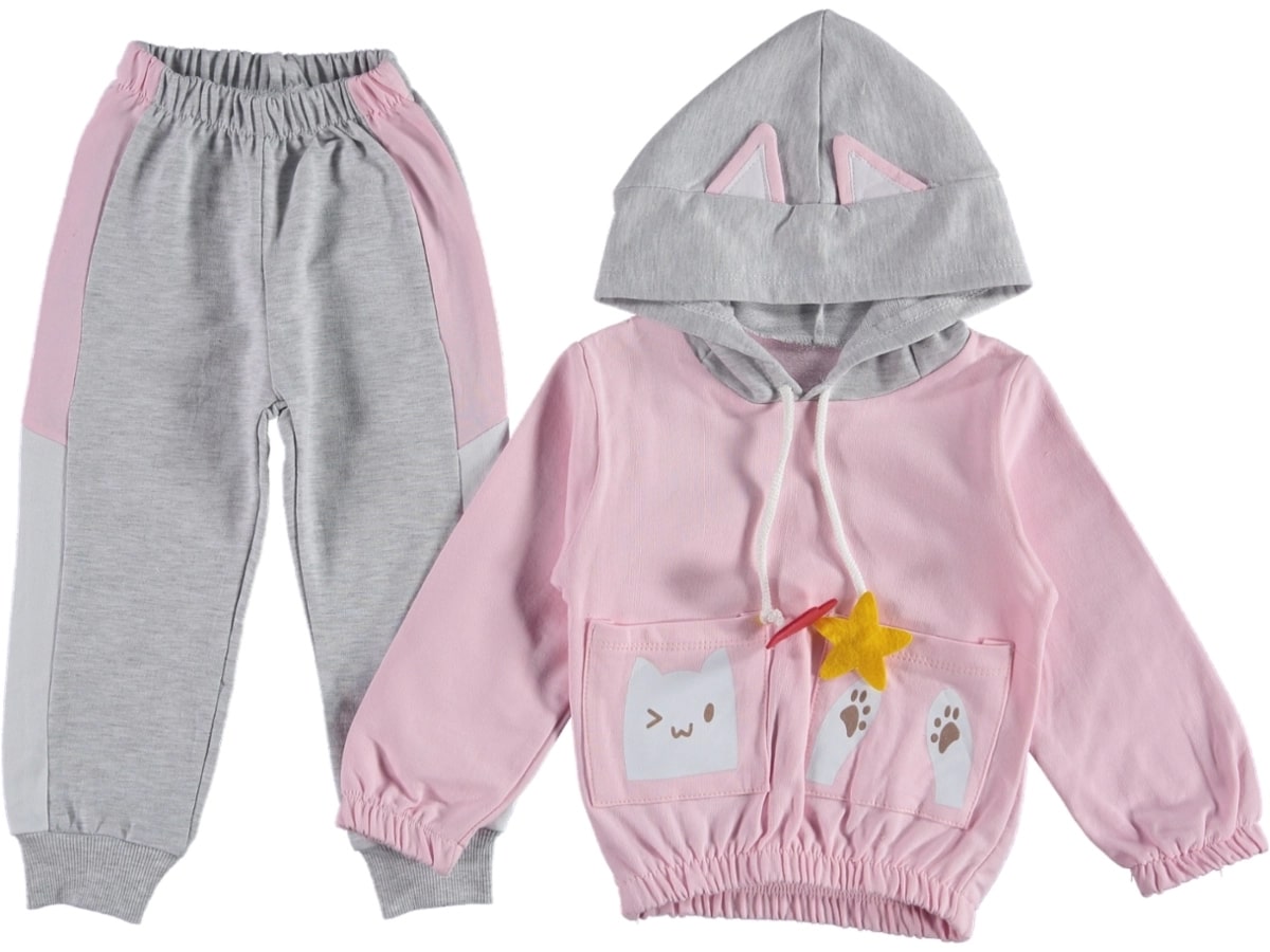 Το σετ αυτό αποτελείται από μία μπλουζίτσα και ένα παντελονάκι. Η μπλουζίτσα είναι σε ροζ χρώμα με κουκούλα που έχει αυτάκια και έχει σχέδιο στάμπα γατούλα. Το παντελονάκι είναι γκρι και έχει λάστιχο περιμετρικά στη μέση.