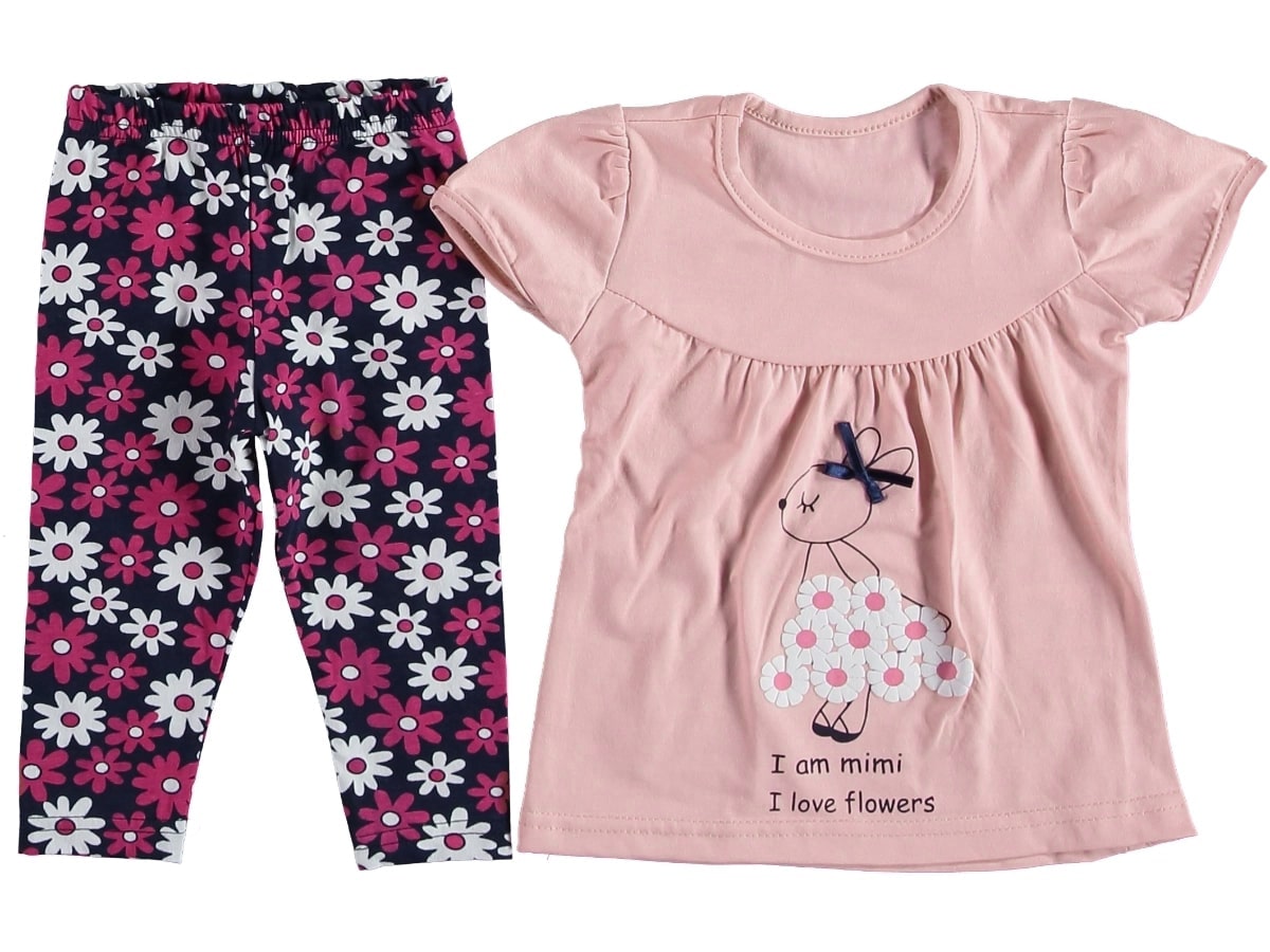 Το σετ αυτό αποτελείται από ένα κοντομάνικο μπλουζοφόρεμα και ένα παντελονάκι κάπρι. Το μπλουζοφόρεμα είναι σε σομόν χρώμα και έχει σχέδιο λαγουδάκι με λουλουδάκια και γράφει “I Am Mimi I Love Flowers”. Το παντελονάκι είναι κάπρι σε σκούρο μπλε χρώμα με σχέδιο λουλουδάκια και έχει λάστιχο περιμετρικά στη μέση.