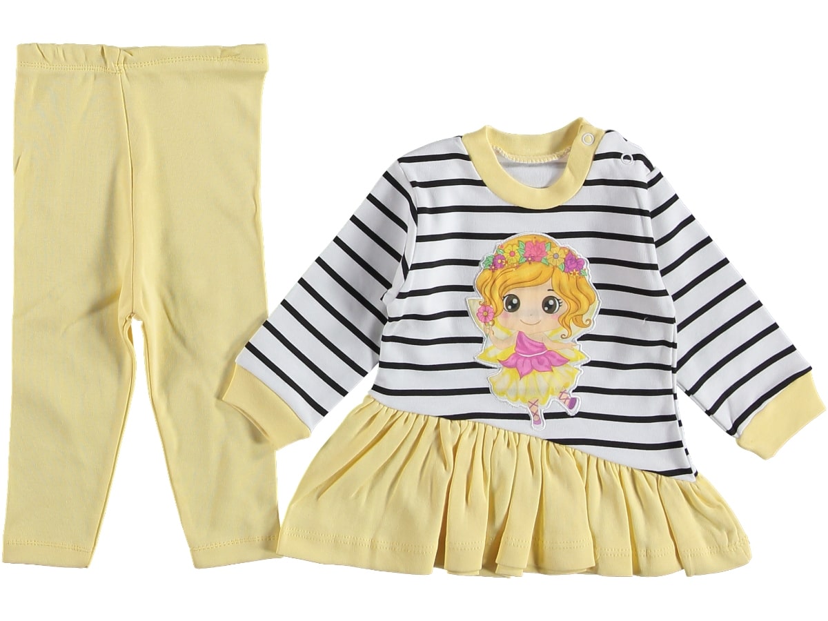 Το σετ αυτό αποτελείται από ένα μπλουζοφόρεμα και ένα παντελονάκι. Το μπλουζοφόρεμα είναι σε άσπρο χρώμα με σχέδιο ρίγες και απλικέ νεράιδα. Το παντελονάκι είναι σε κίτρινο χρώμα και έχει λάστιχο περιμετρικά στη μέση.
