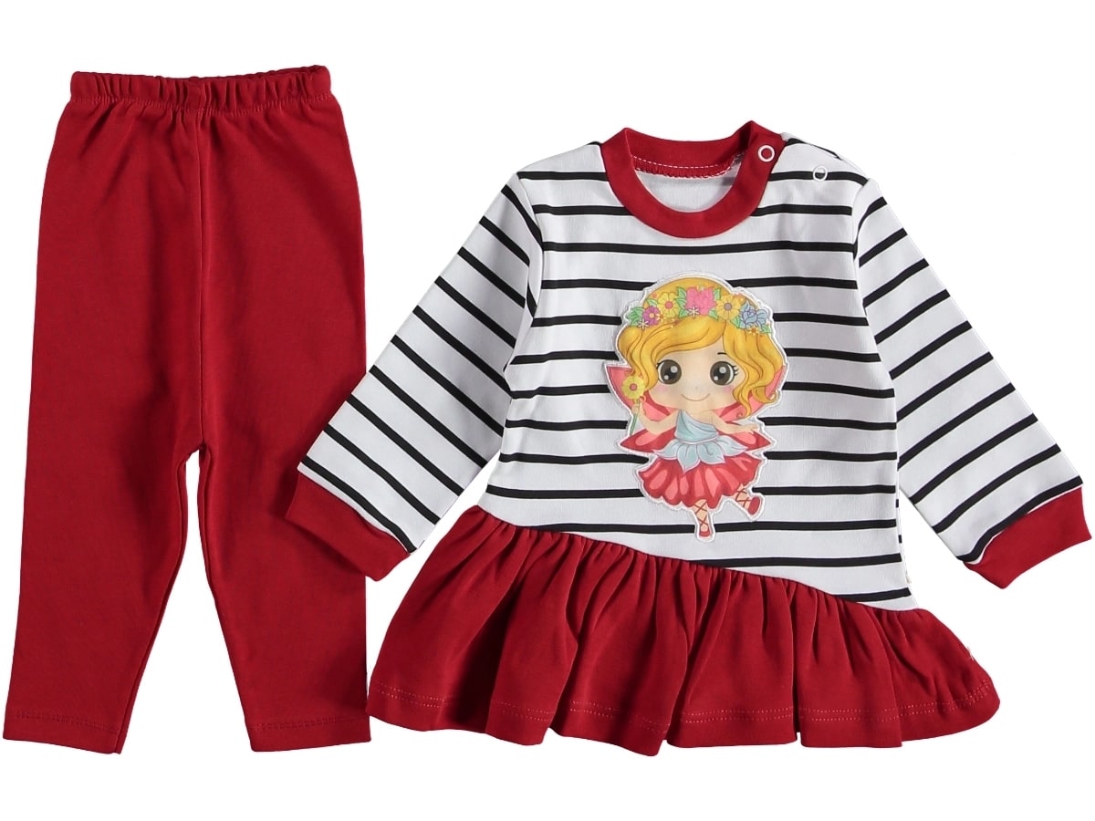 Το σετ αυτό αποτελείται από ένα μπλουζοφόρεμα και ένα παντελονάκι. Το μπλουζοφόρεμα είναι σε άσπρο χρώμα με σχέδιο ρίγες και απλικέ νεράιδα. Το παντελονάκι είναι σε κόκκινο χρώμα και έχει λάστιχο περιμετρικά στη μέση.