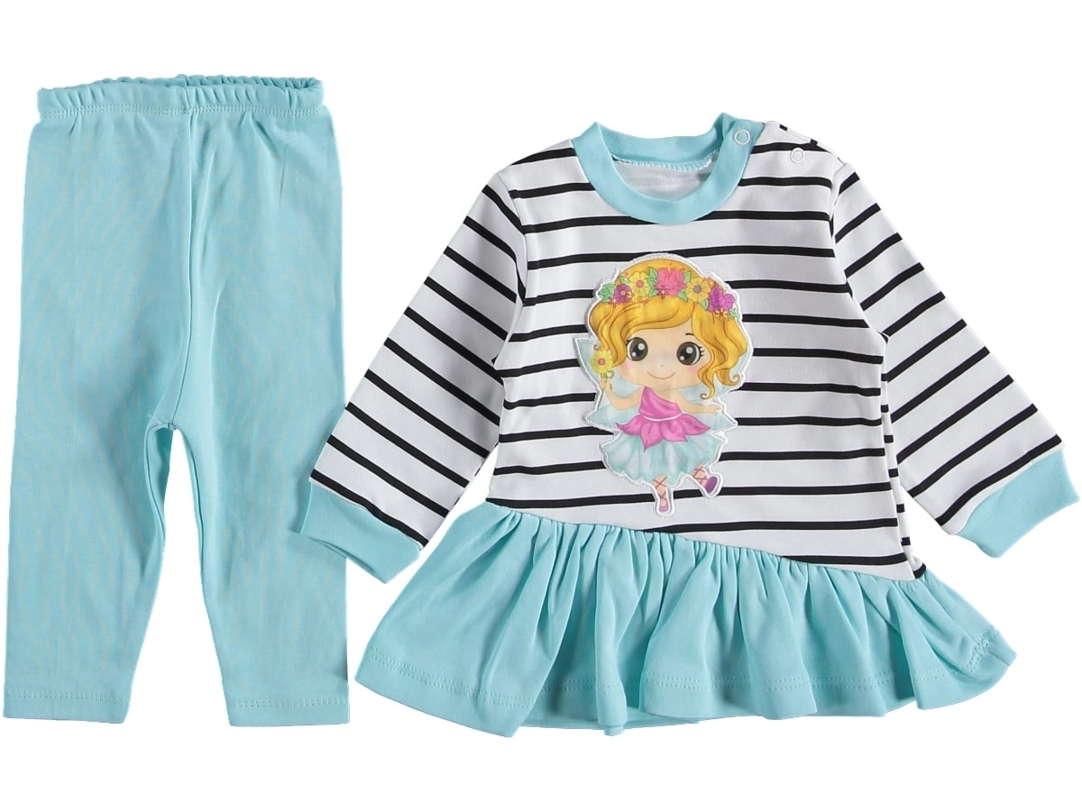 Το σετ αυτό αποτελείται από ένα μπλουζοφόρεμα και ένα παντελονάκι. Το μπλουζοφόρεμα είναι σε άσπρο χρώμα με σχέδιο ρίγες και απλικέ νεράιδα. Το παντελονάκι είναι σε βεραμάν χρώμα και έχει λάστιχο περιμετρικά στη μέση.