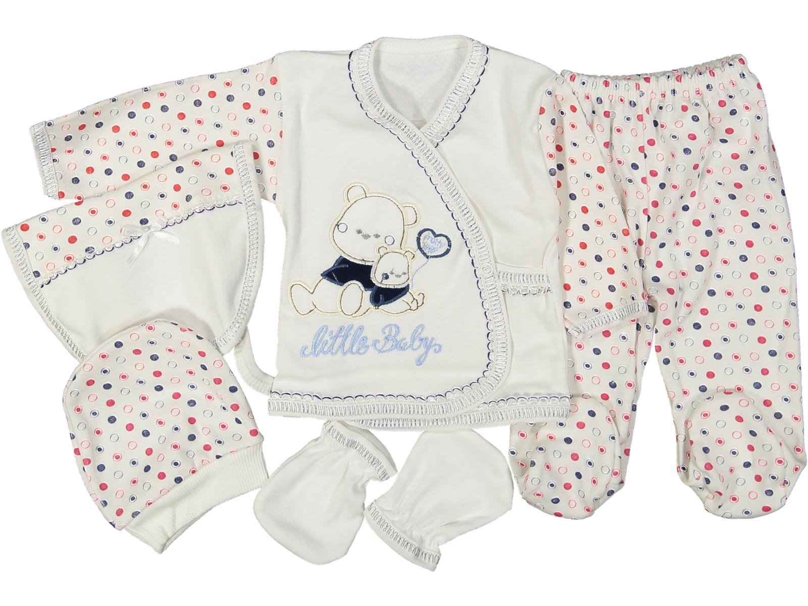 Το σετ αυτό αποτελείται από 5 κομμάτια, ζακετάκι, παντελονάκι, σκουφάκι, γαντάκια και σαλιάρα. Το ζακετάκι έχει σχέδιο αρκουδάκια σε σκούρο μπλε χρώμα και γράφει “Little Baby”. Το παντελονάκι έχει σχέδιο πουά κόκκινο και λάστιχο περιμετρικά στη μέση και έχει κλειστά ποδαράκια.