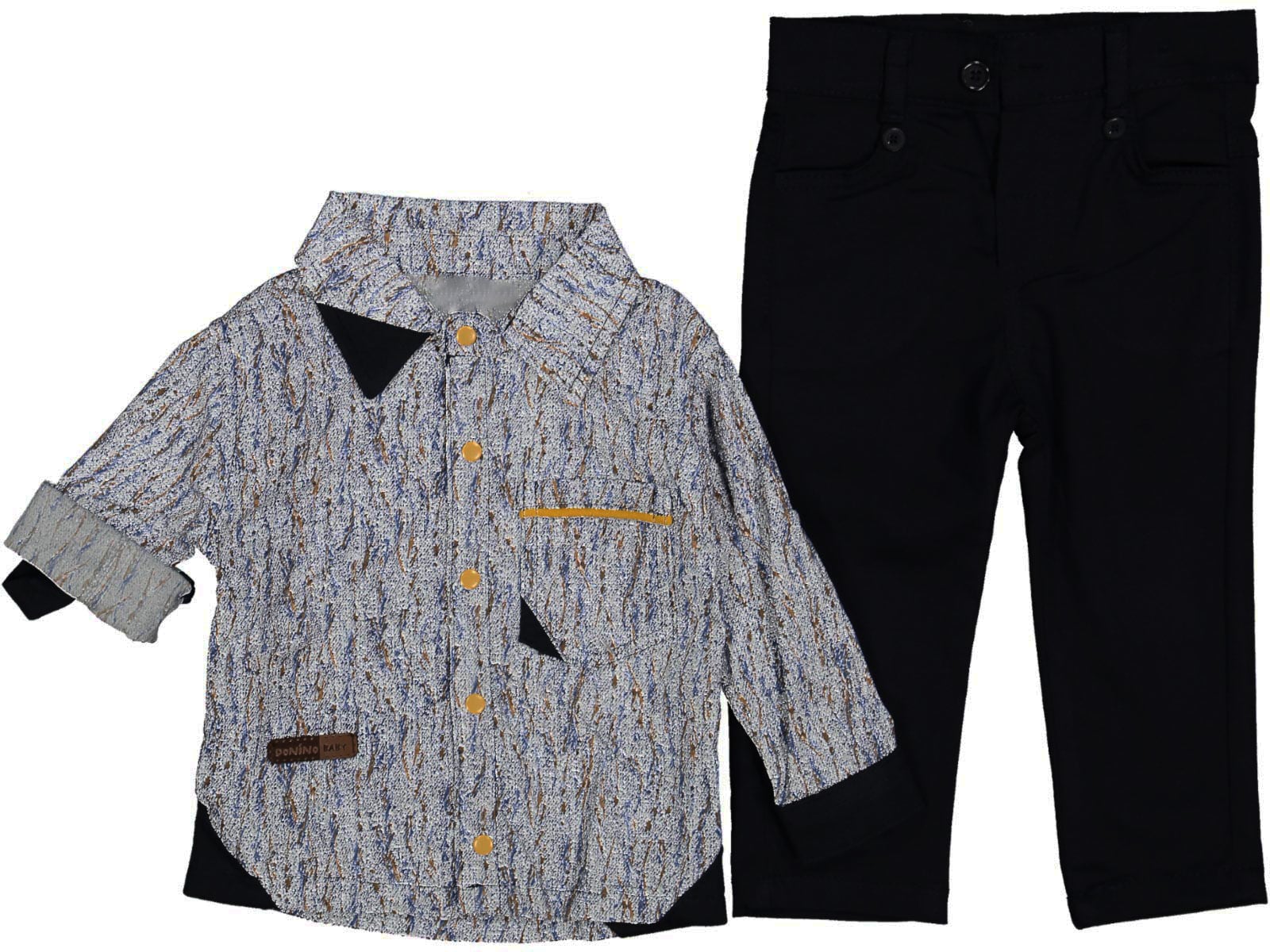 Το σετ αποτελείται από ένα πουκαμισάκι και ένα παντελονάκι. Το πουκαμισάκι είναι σε κίτρινο χρώμα με σχέδιο και τσεπούλα. Το παντελονάκι είναι καμπαρντινέ σε σκούρο μπλε χρώμα με 2 τσεπούλες μπροστά και 2 τσεπούλες πίσω και έχει λάστιχο περιμετρικά στη μέση.