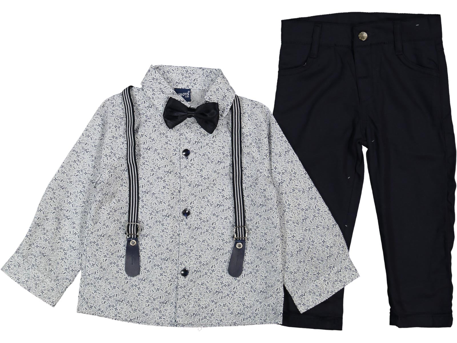 Το σετ αποτελείται από ένα πουκαμισάκι, ένα αποσπώμενο παπιγιόν και ένα παντελονάκι. Το πουκαμισάκι είναι σε σκούρο μπλε χρώμα με σχέδιο λαχούρι και αποσπώμενο παπιγιόν και τιράντες. Το παντελονάκι είναι καμπαρντινέ σε σκούρο μπλε χρώμα με 2 τσεπούλες μπροστά και 1 τσεπούλα πίσω.