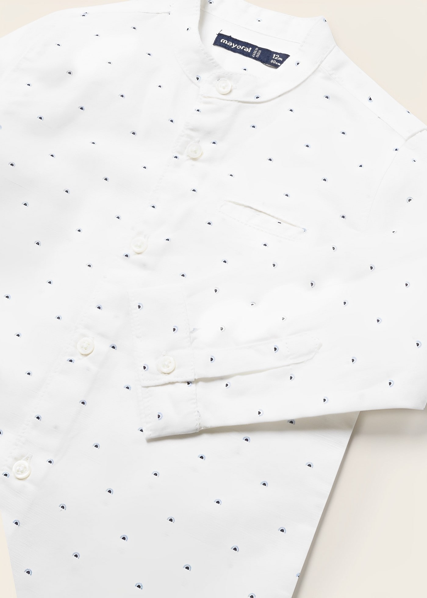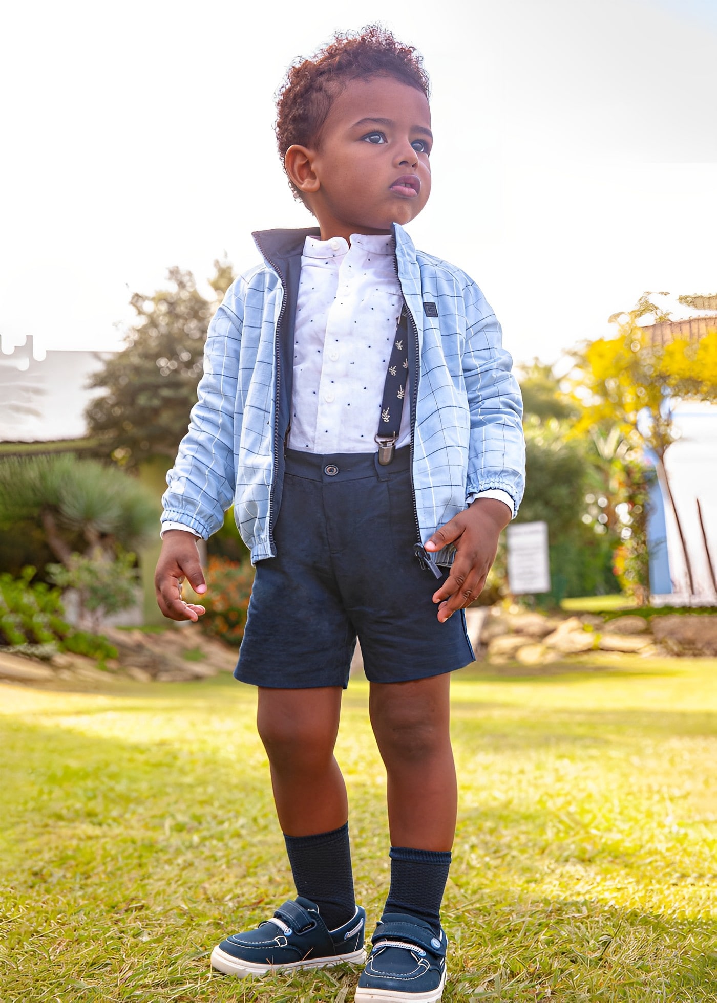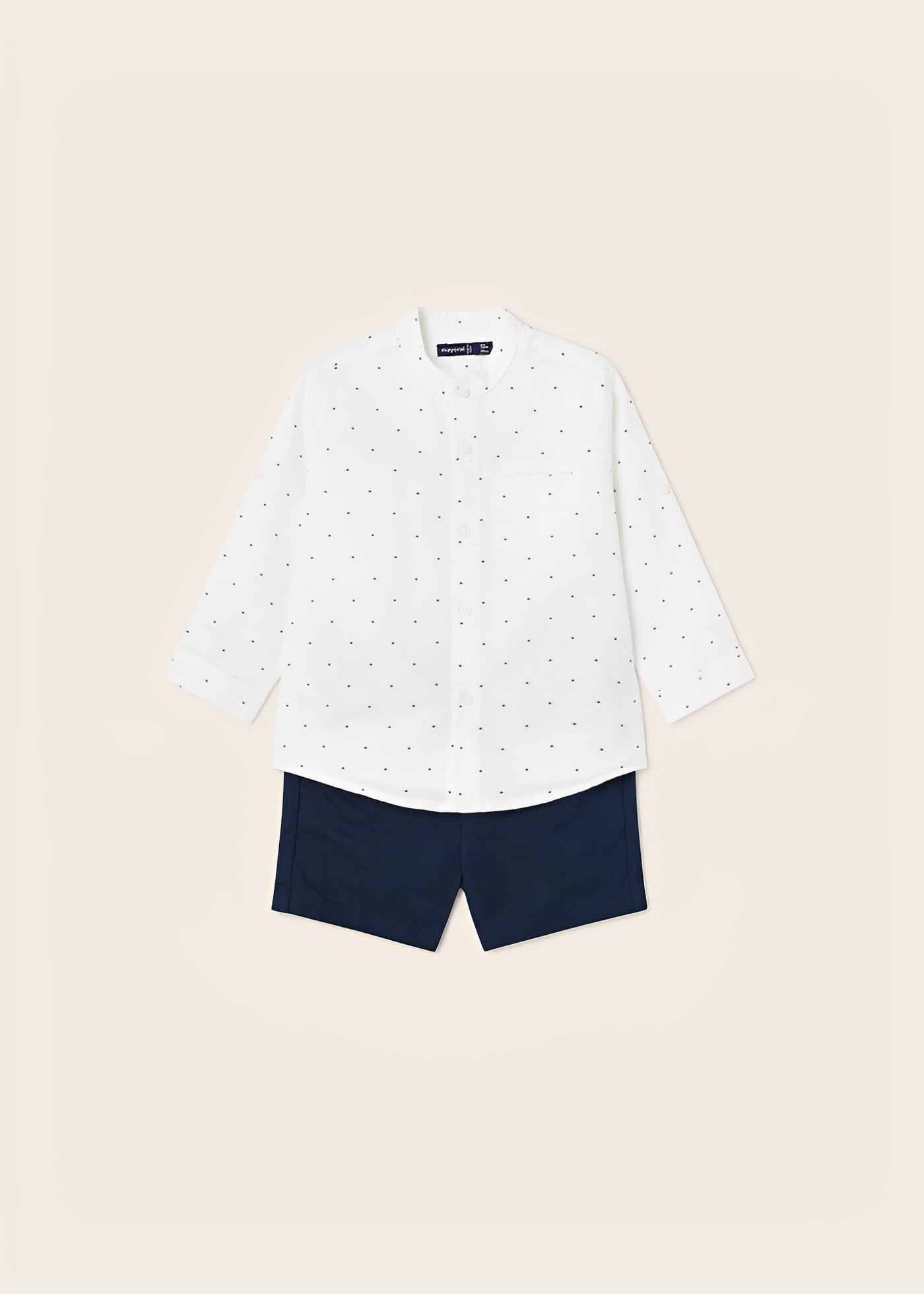 Το σετ αυτό αποτελείται από ένα μακρυμάνικο πουκαμισάκι, και σορτάκι. Το πουκάμισο είναι λινό σε άσπρο χρώμα με τσεπούλα στο πέτο και άνοιγμα με κουμπάκια. Το σορτς είναι καμπαρντινέ σε σκούρο μπλε χρώμα και έχει θυλάκια για ζώνη καθώς και τσεπούλες. Είναι ιδανικό για επίσημες περιστάσεις, ώστε ο μικρός σας να “κλέψει” τα βλέμματα!