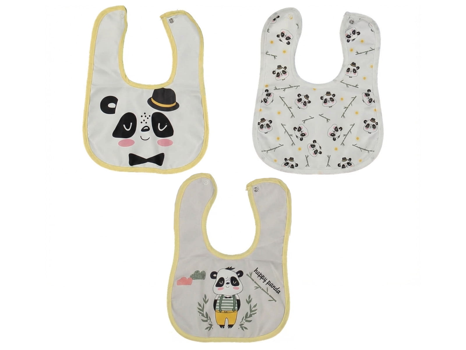 Ένα πρακτικό και πανέμορφο σετ από 3 βρεφικές σαλιάρες σε λευκές και κίτρινες αποχρώσεις, με πρωταγωνιστή ένα γλυκό αρκουδάκι panda.