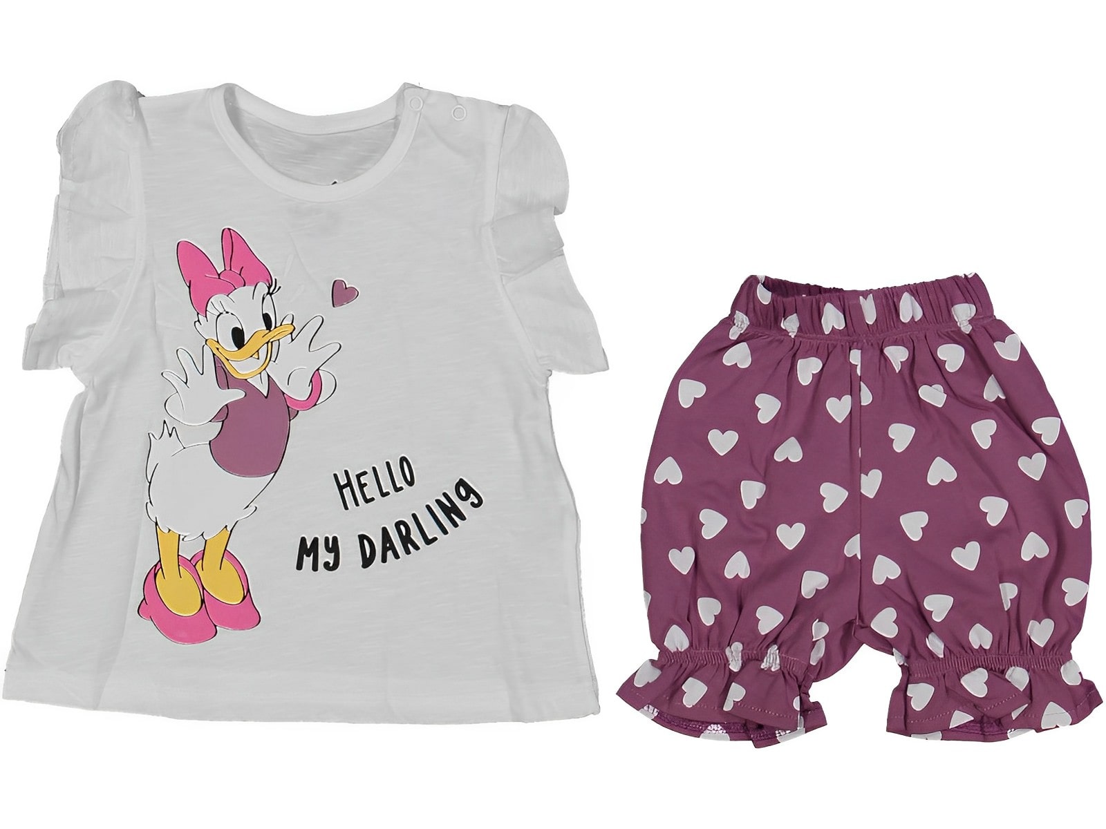 Το σετ αυτό αποτελείται από αμάνικη μπλουζίτσα και παντελονάκι σορτς. Η μπλουζίτσα είναι σε άσπρο χρώμα, έχει σχέδιο στάμπα αγαπημένη ηρωίδα κινουμένων σχεδίων και γράφει “Hello My Darling”. Το σορτσάκι είναι σε μωβ χρώμα με σχέδιο άσπρες καρδούλες, ενώ έχει λάστιχο περιμετρικά στη μέση και στο τελείωμα.