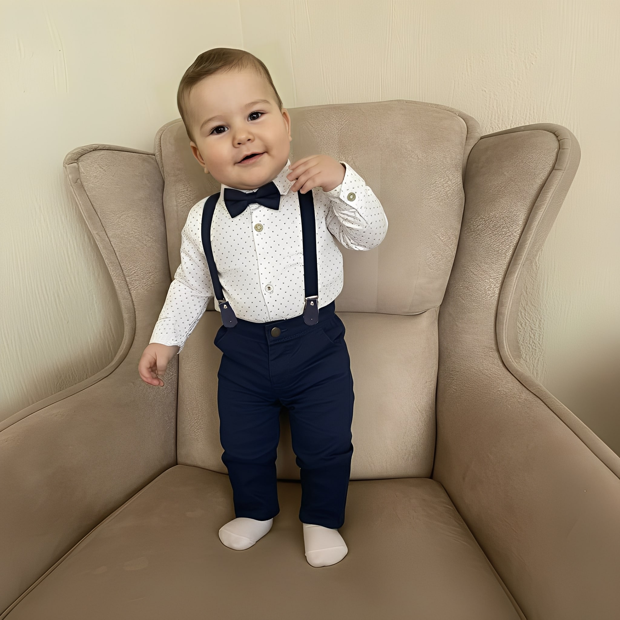 Το σετ είναι βρεφικό και αποτελείται από ένα πουκαμισάκι κορμάκι, ένα παντελονάκι και ξεχωριστές τιράντες και παπιγιόν. Το κορμάκι είναι ελαστικό στο κάτω μέρος, σε άσπρο χρώμα με σχέδιο ρόμβους και έχει άνοιγμα με κουμπάκια και τρουκς στο κάτω μέρος. Το παντελονάκι είναι καμπαρντινέ σε σκούρο μπλε χρώμα και διαθέτει θυλάκια για ζώνη. Οι τιράντες είναι μονόχρωμες και είναι σε σκούρο μπλε χρώμα όπως και το παπιγιόν.