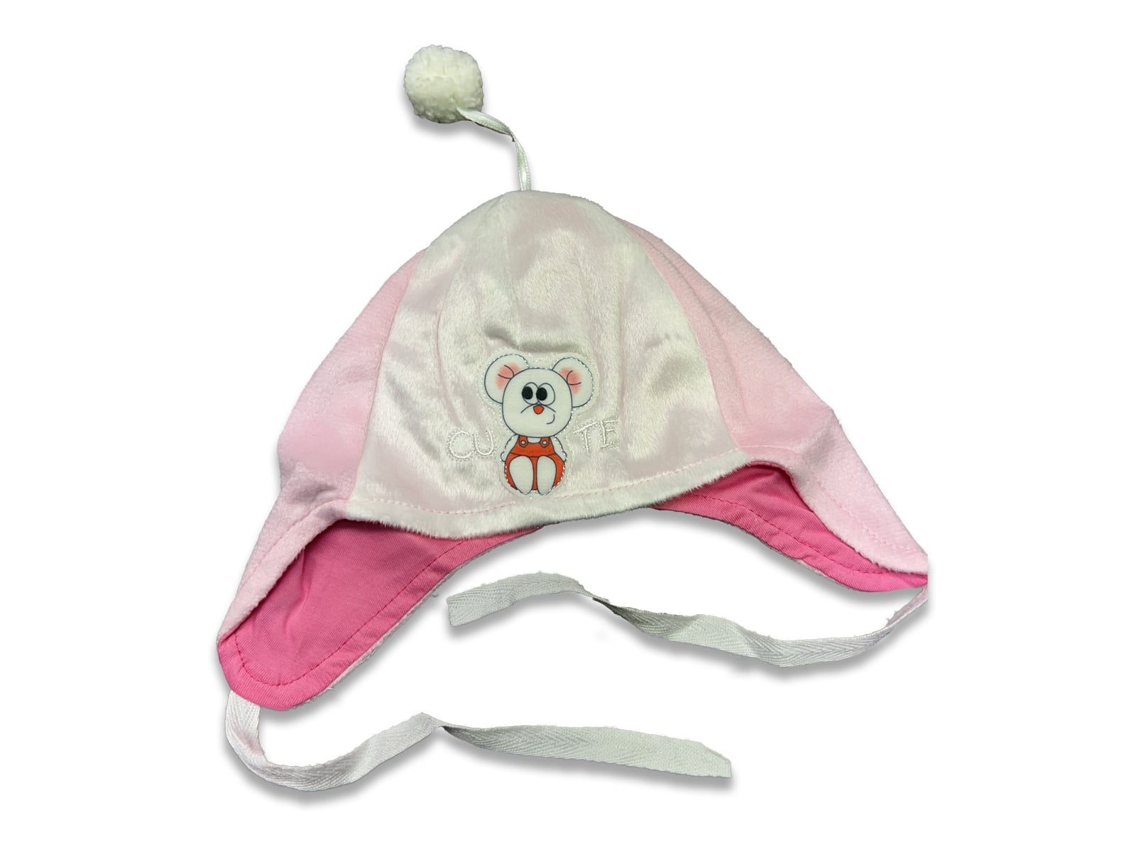 Σκουφάκι με πον πον στην κορυφή και δέσιμο με κορδόνι. Έχει σχέδιο ποντικάκι, γράφει “Cute” και είναι σε ροζ χρώμα. Για ηλικίες 0-12 μηνών. Τα χρώματα ενδέχεται να διαφέρουν ελάχιστα από αυτά της φωτογραφίας.