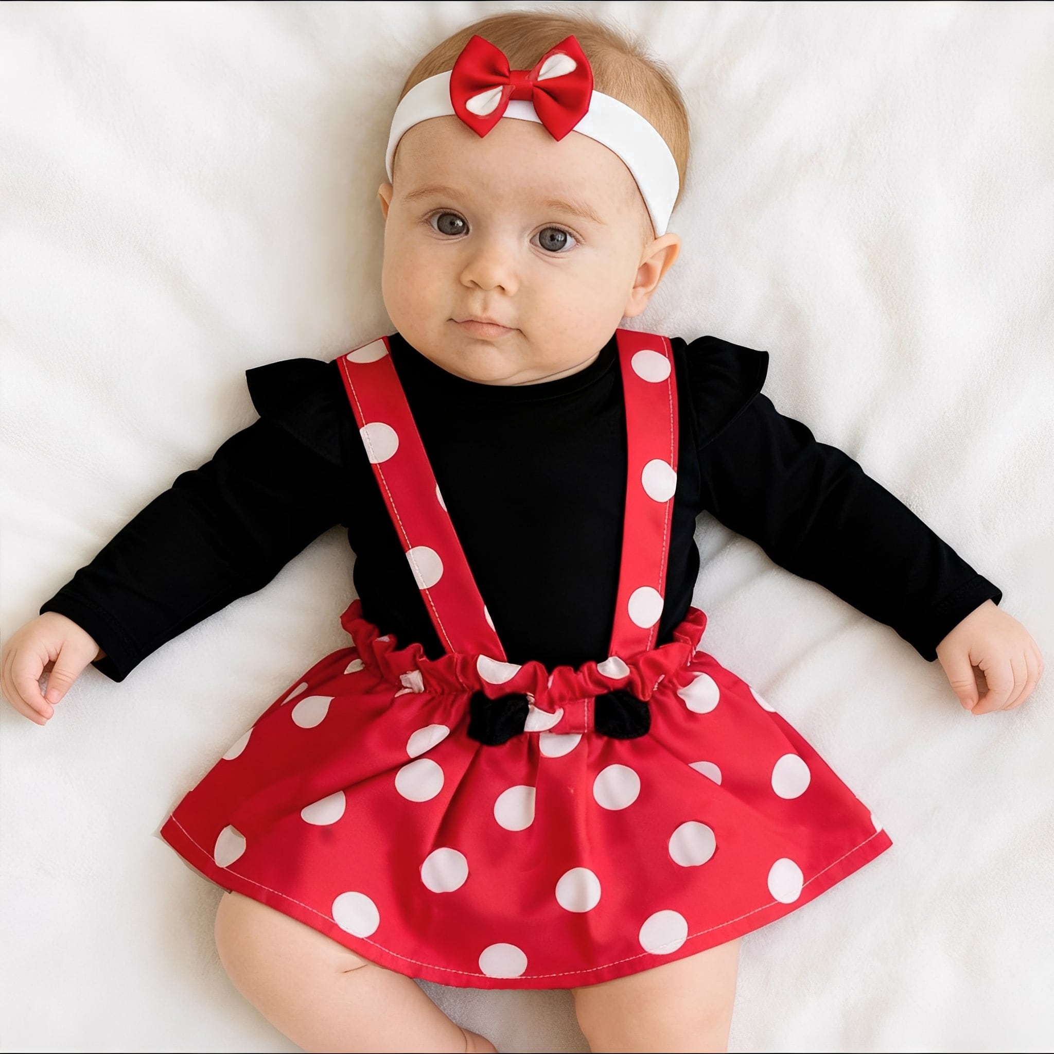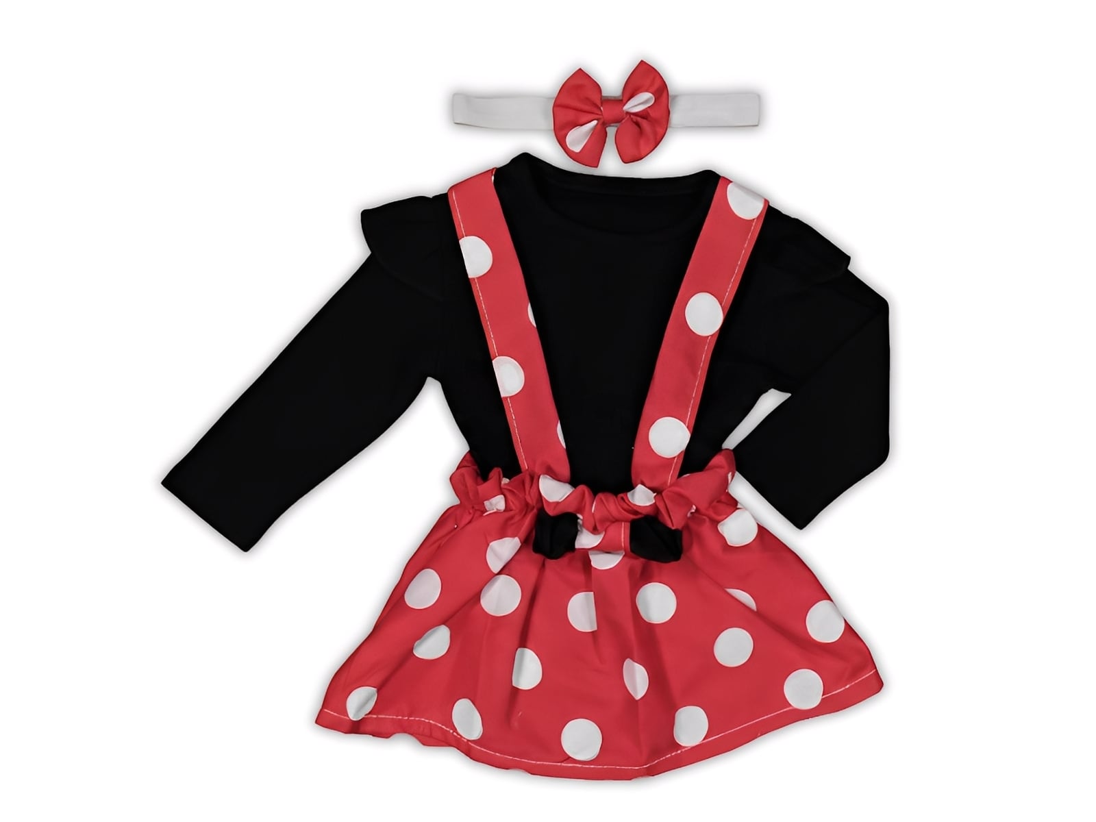 Το σετ αυτό αποτελείτε από φουστίτσα Σαλοπέτα και μακρυμάνικη μπλουζίτσα. Η φούστα είναι σε κόκκινο χρώμα με πουά σχέδιο και φιόγκο στο κέντρο της. με λάστιχο περιμετρικά στην μέση για μεγαλύτερη ευκολία. Το κορμάκι (ζιπουνάκι) είναι μακρυμάνικο σε μαύρο χρώμα με βολάν στους ώμους. Το εσώρουχο αυτό έχει κλείσιμο με τρουκς στο κάτω μέρος, για εύκολη αλλαγή πάνας. Η κορδέλα είναι σε άσπρο χρώμα με κόκκινο φιογκάκι.