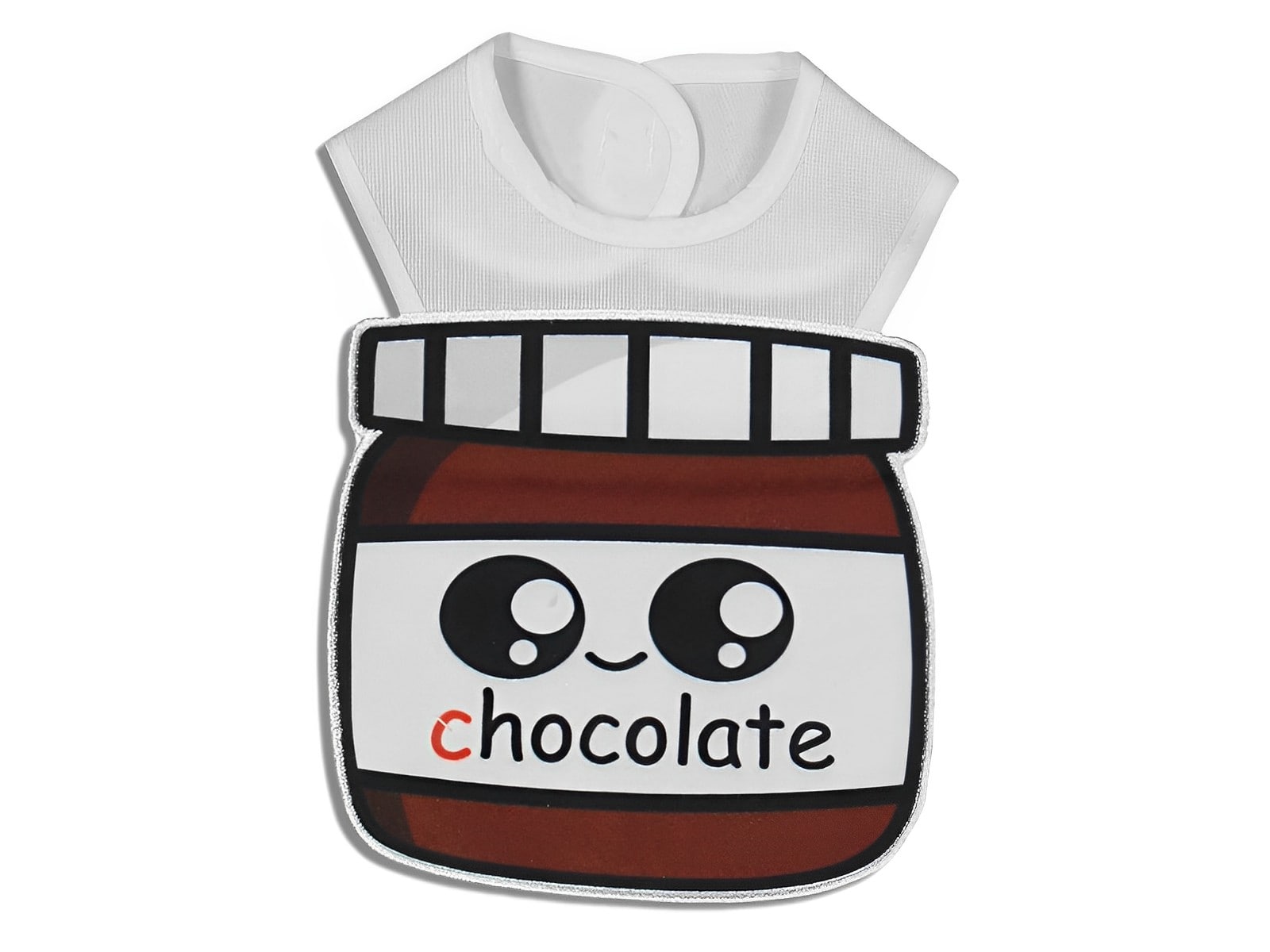 Παιδική σαλιάρα με σχέδιο μερέντα που γράφει “Chocolate”, είναι σε καφέ χρώμα με άσπρες λεπτομέριες. Έχει άνοιγμα με χρατς (velcro) στο πίσω μέρος της.