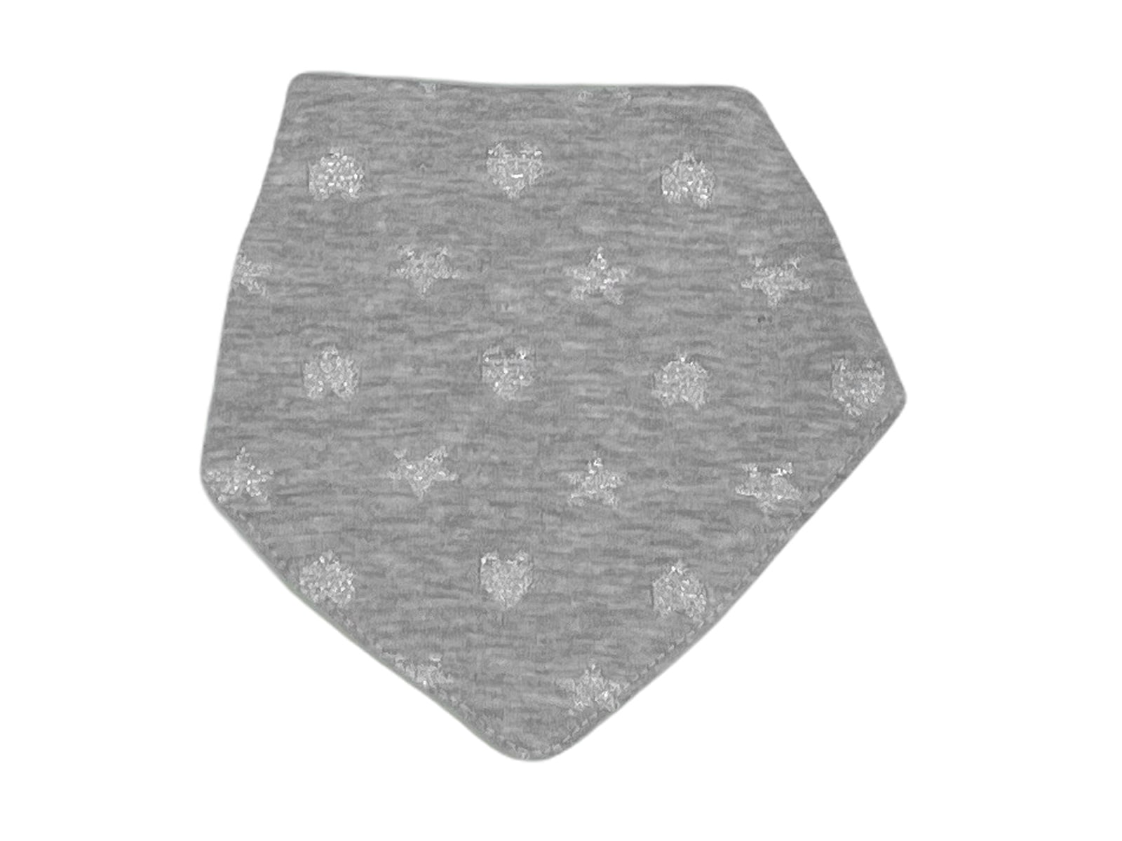 Παιδική σαλιάρα τύπου μπαντάνα σε γκρι χρώμα με σχέδιο καρδούλες και αστεράκια η οποία έχει κούμπωμα με τρουκς (κουμπάκι) στο πίσω μέρος.